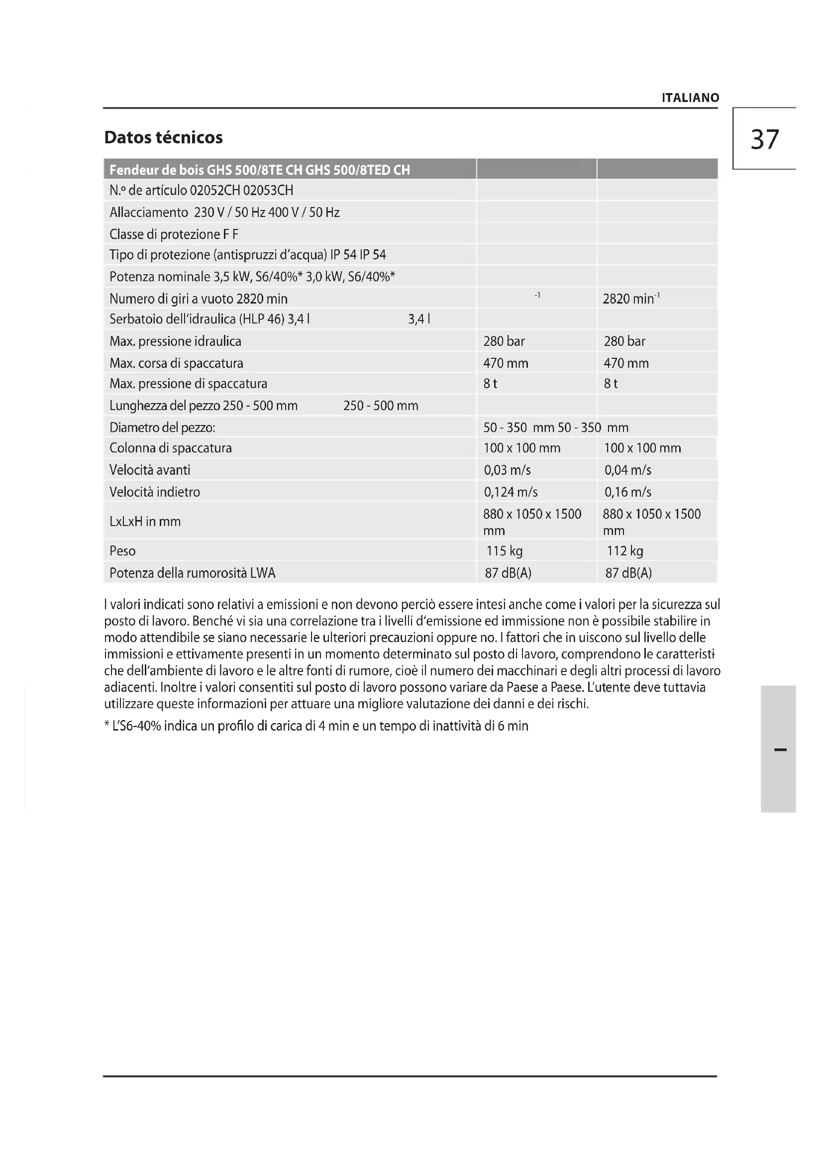 Serbatoio dell‘idraulica (HLP 46) 3,4 l 3,4 l Max. pressione idraulica 280 bar 280 bar Max. corsa di spaccatura 470 mm 470 mm Max. pressione di spaccatura 8 t 8 t Lunghezza del pezzo 250 - 500 mm 250 - 500 mm Diametro del pezzo: 50 - 350 mm 50 - 350 mm Colonna di spaccatura 100 x 100 mm 100 x 100 mm Velocità avanti 0,03 m/s 0,04 m/s Velocità indietro 0,124 m/s 0,16 m/s LxLxH in mm 880 x 1050 x 1500