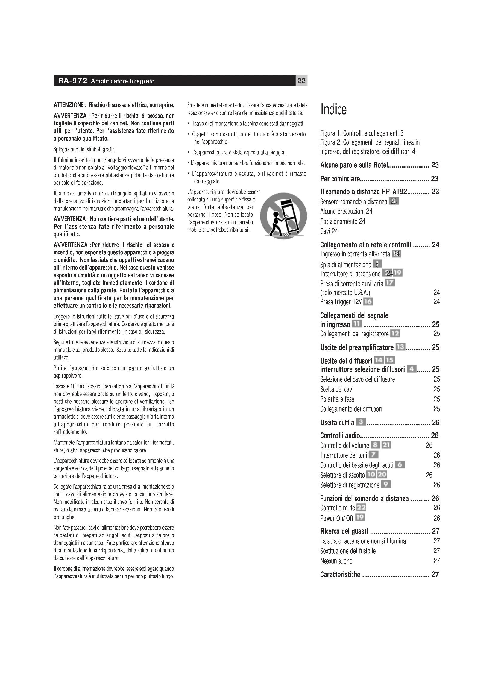 - L’apparecchiatura è caduta, o il cabinet è rimasto danneggiato. L’apparecchiatura dovrebbe essere collocata su una superficie fissa e piana forte abbastanza per portarne il peso. Non collocate l’apparecchiatura su un carrello mobile che potrebbe ribaltarsi. Indice Figura 1: Controlli e collegamenti 3 Figura 2: Collegamenti dei segnali linea in ingresso, del registratore, dei diffusori 4 Alcune parole sulla Rotel...................... 23 Per cominciare..................................... 23 Il comando a distanza RR-AT92............ 23 Sensore comando a distanza 23 Alcune precauzioni 24 Posizionamento 24 Cavi 24 Collegamento alla rete e controlli ......... 24 Ingresso in corrente alternata 24 Spia di alimentazione e Interruttore di accensione 24 Presa di corrente ausiliaria (solo mercato U.S.A.) 24 Presa trigger 12V 24 Collegamenti del segnale in ingresso .................................... 25 Collegamenti del registratore 25 Uscite del preamplificatore ............. 25 Uscite dei diffusori interruttore selezione diffusori ....... 25 Selezione del cavo del diffusore 25 Scelta dei cavi 25 Polarità e fase 25 Collegamento dei diffusori 25 Uscita cuffia .................................. 26 Controlli audio..................................... 26 Controllo del volume 26 Interruttore dei toni 26 Controllo dei bassi e degli acuti 26 Selettore di ascolto 26 Selettore di registrazione 26 Funzioni del comando a distanza .......... 26 Controllo mute 26 Power On/Off 26 Ricerca dei guasti ................................ 27 La spia di accensione non si Illumina 27 Sostituzione del fusibile 27 Nessun suono 27 Caratteristiche .................................... 2723 Italiano Alcune parole sulla Rotel Una famiglia, la cui passione per la musica ha spinto a realizzare componenti hi-fi di elevata qualità, fondò la Rotel più di 40 anni fa. Attraverso gli anni la passione è rimasta intatta e l’obbiettivo di offrire prodotti eccezionali agli audiofili e amanti della musica ad un costo non elevato è condiviso da tutti alla Rotel. Gli ingegneri lavorano come una squadra affiatata, ascoltando e mettendo a punto ogni nuovo prodotto finché non raggiunge perfettamente i loro standard musicali. Sono liberi di scegliere i componenti in qualsiasi parte del mondo al fine di realizzare il prodotto nel miglior modo possibile. Così potrete trovare condensatori provenienti dall’Inghilterra e dalla Germania, semiconduttori dal Giappone o dagli Stati Uniti, mentre i trasformatori toroidali sono prodotti proprio dalla Rotel. La fama di eccellenza della Rotel è stata guadagnata grazie a centinaia di ottime recensioni e riconoscimenti conferiti dai più autorevoli esperti del settore, che ascoltano la musica ogni giorno. I loro commenti confermano l’ obiettivo della società - La ricerca di un apparecchio che sia musicale, affidabile e conveniente. Vi ringraziamo per aver scelto questo prodotto augurandovi molte ore di piacevole intrattenimento musicale. Per cominciare Grazie per aver acquistato l’amplificatore stereo integrato Rotel RA-972. Utilizzato in un impianto hi-fi di alta qualità vi garantirà numerosi anni di intrattenimento musicale. L’RA-972 è un amplificatore versatile di el- evate prestazioni. Tutti gli aspetti del design sono stati ottimizzati per conservare la piena gamma dinamica e per restituirvi anche i minimi dettagli della vostra musica. L’RA-972 ha uno stadio di alimentazione altamente regolato che comprende un trasformatore toroidale specificamente progettato dalla Rotel e appositi condensatori slit-foil. Questa alimentazione a bassa impedenza ha ampie riserve di potenza che consentono all’RA-972 di riprodurre i segnali audio più complessi. Questo tipo di progetto è più costoso da produrre ma è migliore per la musica. Abbiamo progettato le schede dei circuiti stampati (PCB) con Tracce a Circuito Simmetrico. Ciò garantisce che il tempo esatto della musica venga mantenuto e fedelmente riprodotto. La circuitazione dell’RA-972 contiene resistenze a film metallico e condensatori in polistirene o polipropilene che vengono utilizzati in sezioni critiche sul percorso del segnale. Tutti gli aspetti di questo progetto sono stati studiati con lo scopo fi- nale di ottenere la più fedele riproduzione sonora. L’RA-972 è dotato inoltre di selettori indipendenti per il segnale d’ingresso. Questi vi consentono di ascoltare una sorgente mentre ne registrate un’altra. L’installazione dell’RA-972 e il suo funzionamento sono semplici. Se avete già esperienza con altri sistemi stereo, non dovreste incontrare alcuna difficoltà. Collegate semplicemente i componenti abbinati e ascoltate la musica. Il comando a distanza RR-AT92 Alcune funzioni possono essere attivate sia con i controlli sul pannello frontale sia con il comando a distanza RR-AT92 fornito in dotazione. Quando queste operazioni vengono descritte, il numero di chiamata per entrambi i controlli viene mostrato. Per esempio, voi potete selezionare la sorgente che volete ascoltare sia con il selettore d’ascolto sia con i pulsanti del comando a distanza