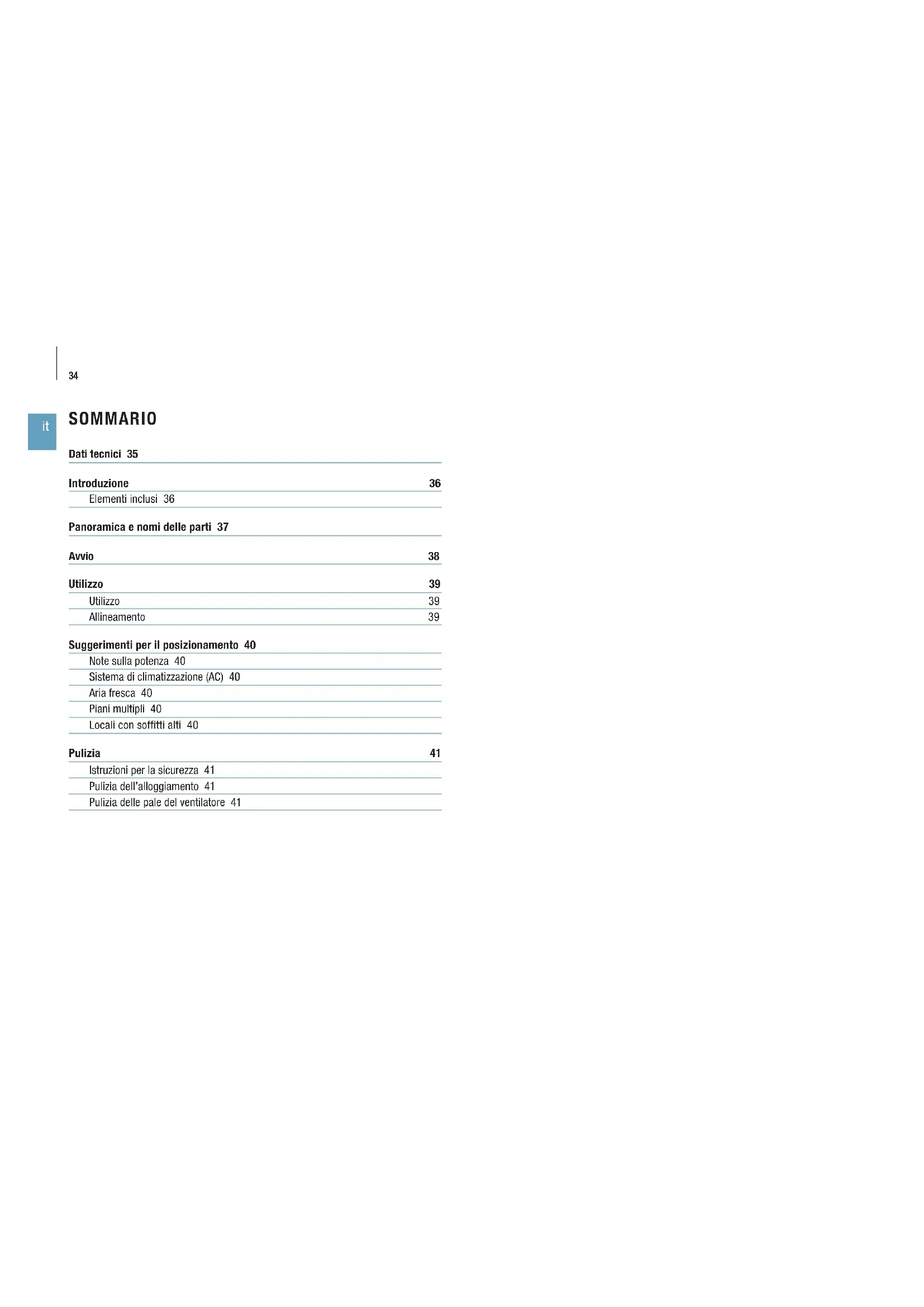 SOMMARIO Dati tecnici 35 Introduzione 36 Elementi inclusi 36 Panoramica e nomi delle parti 37 Avvio 38 Utilizzo 39 Utilizzo 39 Allineamento 39 Suggerimenti per il posizionamento 40 Note sulla potenza 40 Sistema di climatizzazione (AC) 40 Aria fresca 40 Piani multipli 40 Locali con soffitti alti 40 Pulizia 41 Istruzioni per la sicurezza 41 Pulizia dell’alloggiamento 41 Pulizia delle pale del ventilatore 4135