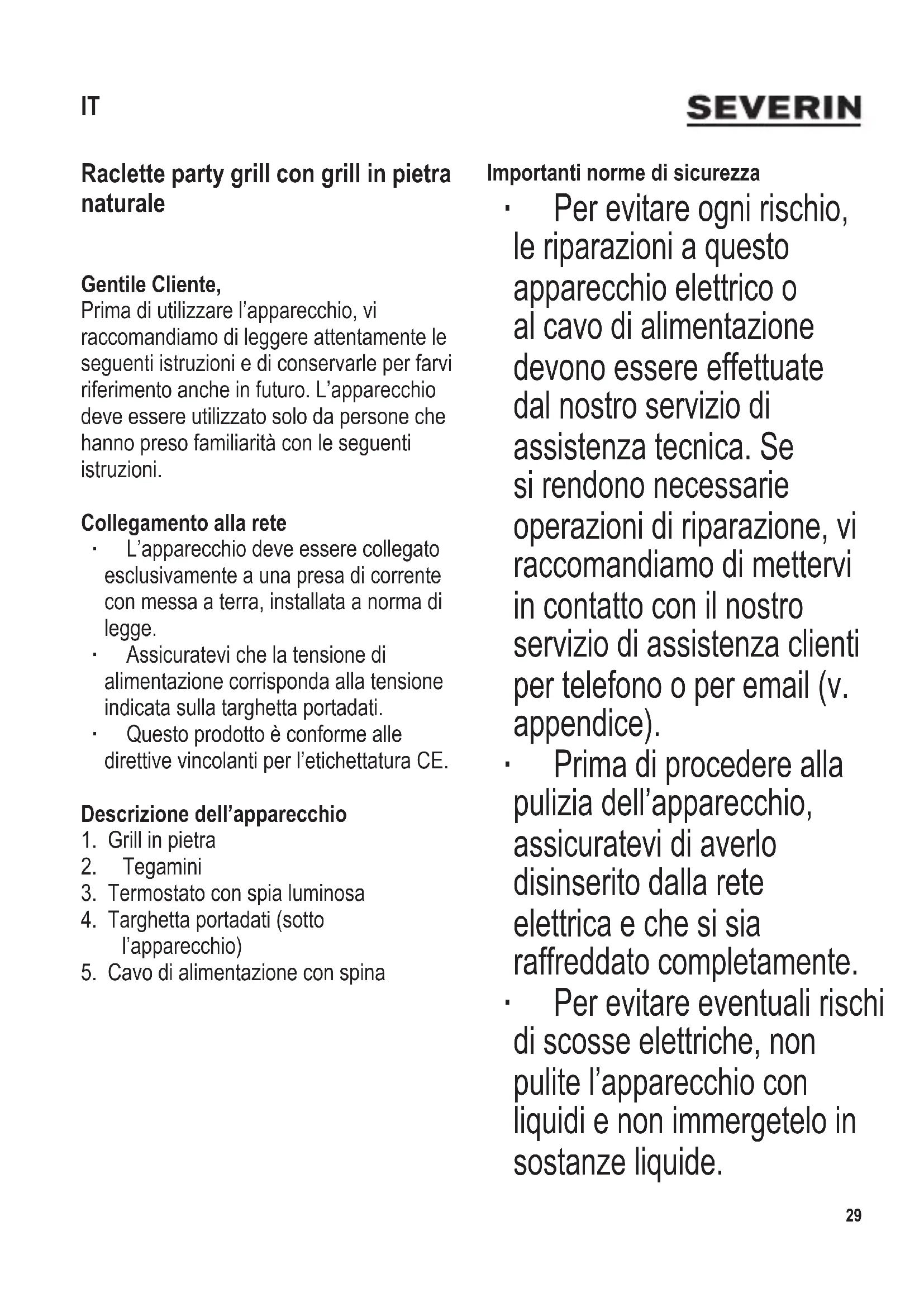 Importanti norme di sicurezza ∙ Per evitare ogni rischio, le riparazioni a questo apparecchio elettrico o al cavo di alimentazione devono essere effettuate dal nostro servizio di assistenza tecnica. Se si rendono necessarie operazioni di riparazione, vi raccomandiamo di mettervi in contatto con il nostro servizio di assistenza clienti per telefono o per email (v. appendice). ∙ Prima di procedere alla pulizia dell’apparecchio, assicuratevi di averlo disinserito dalla rete elettrica e che si sia raffreddato completamente. ∙ Per evitare eventuali rischi di scosse elettriche, non pulite l’apparecchio con liquidi e non immergetelo in sostanze liquide. IT30 104 x 142 mm ∙ I tegamini possono essere lavati con acqua calda e detersivo. Il grill in pietra invece può essere pulito solo sotto l’acqua corrente. Per informazioni più dettagliate su come pulire l’apparecchio, consultate la sezione Manutenzione e pulizia. ∙ L’apparecchio non è previsto per l’utilizzo con un timer esterno o con un sistema separato di comando a distanza. ∙ Questo apparecchio è studiato per il solo uso domestico o per impieghi simili, come per esempio - in cucine per il personale, negozi, ufci e altri ambienti simili di lavoro, - in aziende agricole, - da clienti di alberghi, motel e sistemazioni simili, - da clienti di pensioni “bed- and-breakfast” (letto & colazione). ∙ Il presente apparecchio può essere usato da bambini (di almeno 8 anni di età) e da persone con ridotte capacità siche, sensoriali o mentali, o persone senza particolari esperienze o conoscenze, purché siano sotto sorveglianza o siano state date loro istruzioni sull’uso dell’apparecchio e comprendano pienamente i rischi e le precauzioni di sicurezza che l’apparecchio comporta. ∙ Ai bambini non deve essere consentito di giocare con l’apparecchio. ∙ Ai bambini non deve essere consentito di effettuare operazioni di pulizia o di manutenzione sull’apparecchio a104 x 142 mm
