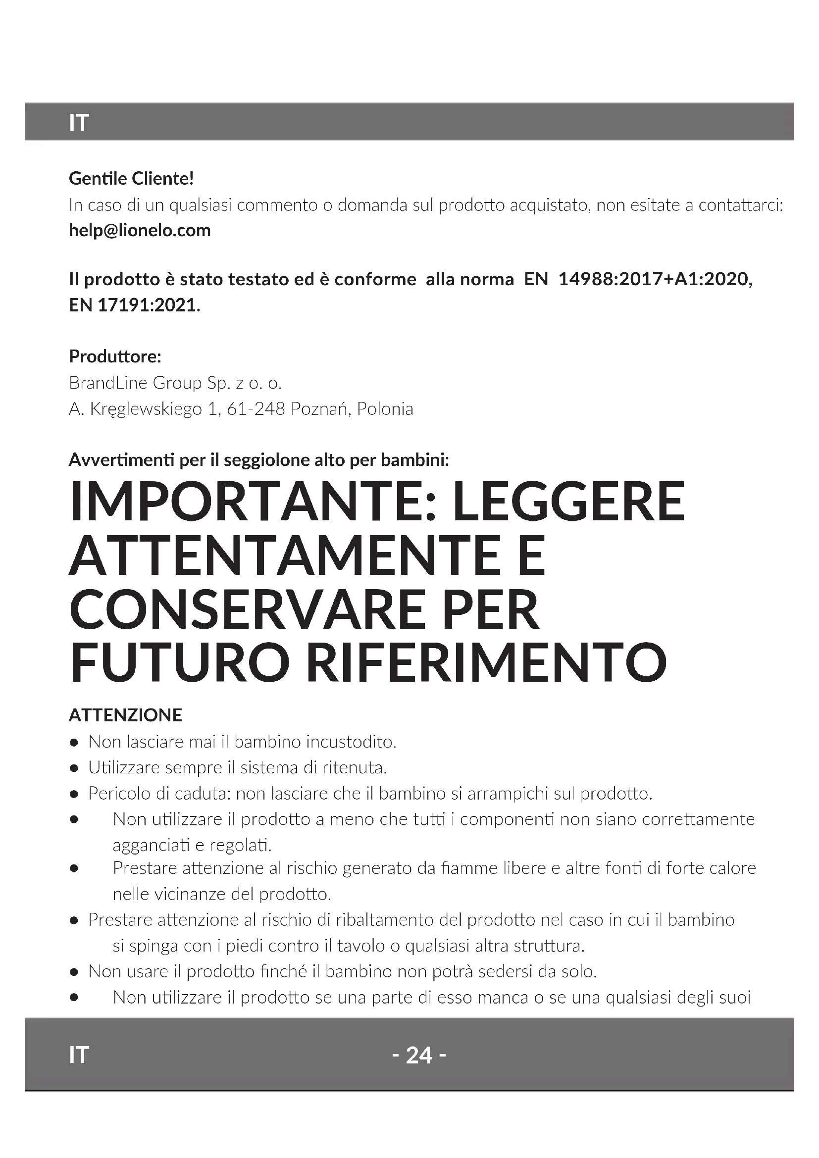 Genle Cliente! In caso di un qualsiasi commento o domanda sul prodoo acquistato, non esitate a contaarci: help@lionelo.com Il prodotto è stato testato ed è conforme alla norma EN 14988:2017+A1:2020, EN 17191:2021. Produore: BrandLine Group Sp. z o. o. A. Kręglewskiego 1, 61-248 Poznań, Polonia Avvermen per il seggiolone alto per bambini: IMPORTANTE: LEGGERE ATTENTAMENTE E CONSERVARE PER FUTURO RIFERIMENTO ATTENZIONE