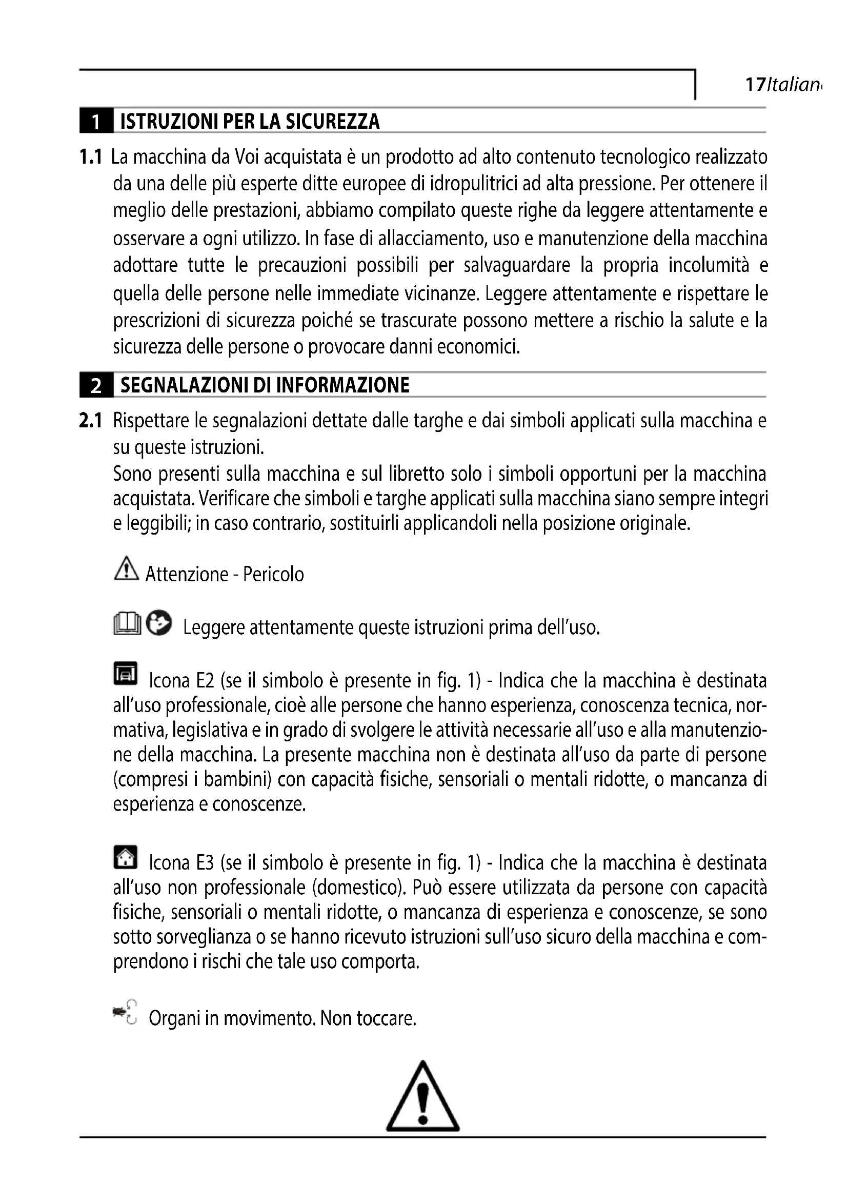 su queste istruzioni. Sono presenti sulla macchina e sul libretto solo i simboli opportuni per la macchina acquistata. Verificare che simboli e targhe applicati sulla macchina siano sempre integri e leggibili; in caso contrario, sostituirli applicandoli nella posizione originale. Attenzione - Pericolo Leggere attentamente queste istruzioni prima dell’uso. Icona E2 (se il simbolo è presente in fig. 1) - Indica che la macchina è destinata all’uso professionale, cioè alle persone che hanno esperienza, conoscenza tecnica, nor