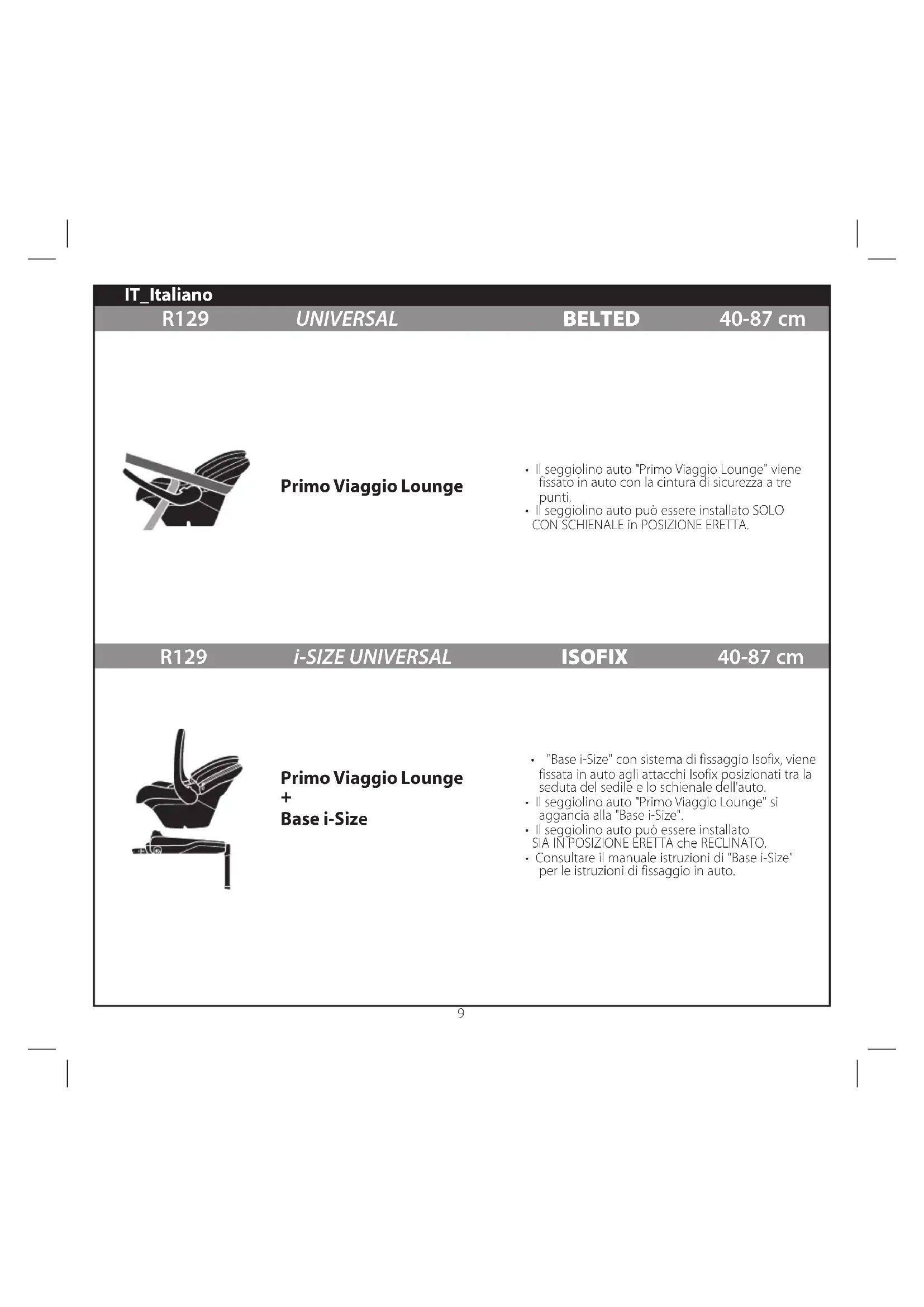 - Il seggiolino auto può essere installato SOLO CON SCHIENALE in POSIZIONE ERETTA. IT_Italiano Primo Viaggio Lounge