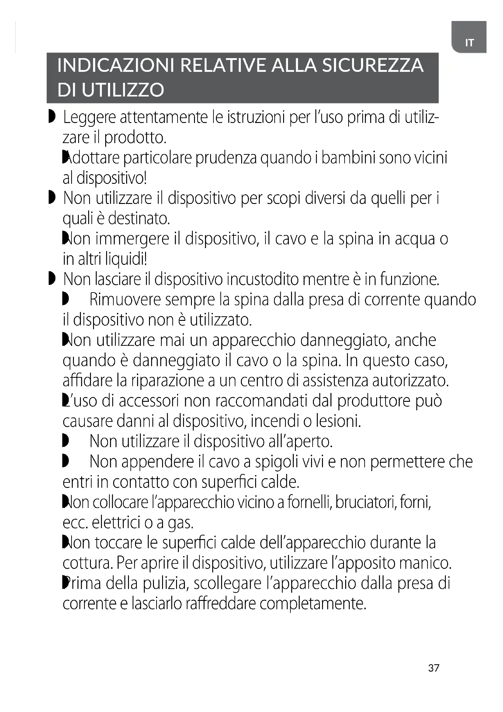 Non immergere il dispositivo, il cavo e la spina in acqua o in altri liquidi! Non lasciare il dispositivo incustodito mentre è in funzione. Rimuovere sempre la spina dalla presa di corrente quando il dispositivo non è utilizzato.
