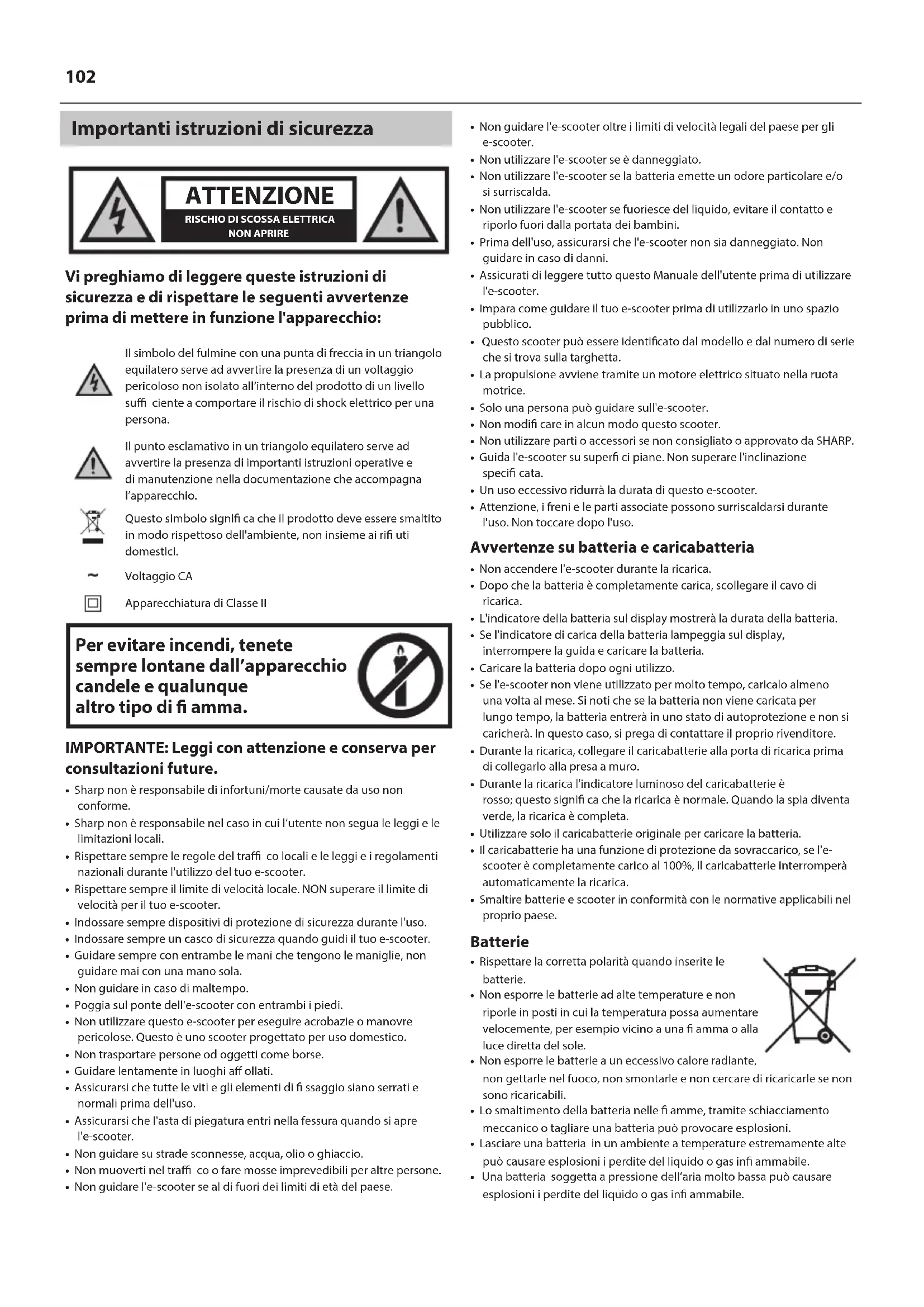 - Questo scooter può essere identi cato dal modello e dal numero di serie che si trova sulla targhetta.• La propulsione avviene tramite un motore elettrico situato nella ruota motrice.• Solo una persona può guidare sull'e-scooter.• Non modi care in alcun modo questo scooter.• Non utilizzare parti o accessori se non consigliato o approvato da SHARP.• Guida l'e-scooter su super ci piane. Non superare l'inclinazione speci cata.• Un uso eccessivo ridurrà la durata di questo e-scooter.• Attenzione, i freni e le parti associate possono surriscaldarsi durante l'uso. Non toccare dopo l'uso. Avvertenze su batteria e caricabatteria