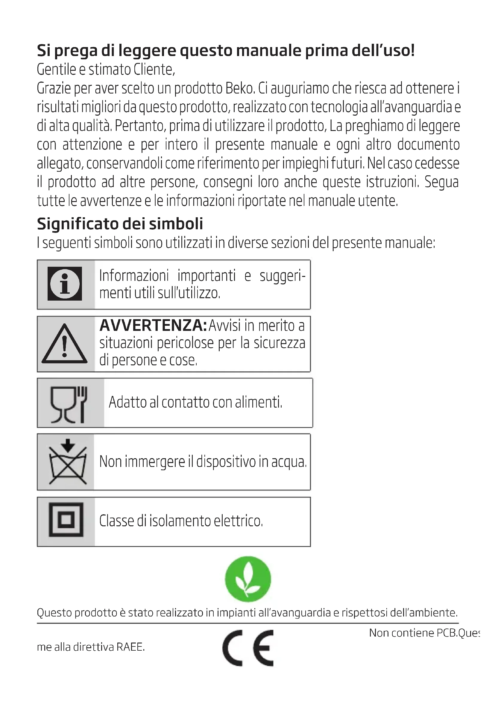 AVVERTENZA: Avvisi in merito a situazioni pericolose per la sicurezza di persone e cose. Adatto al contatto con alimenti. Non immergere il dispositivo in acqua. Classe di isolamento elettrico. Questo prodotto è stato realizzato in impianti all’avanguardia e rispettosi dell’ambiente. Non contiene PCB.Questo dispositivo risulta confor- me alla direttiva RAEE.84 / IT Mixer / Manuale Utente