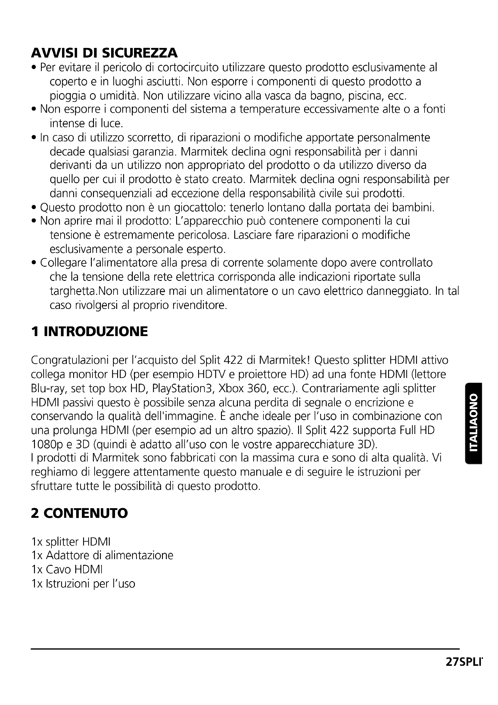 - Collegare l’alimentatore alla presa di corrente solamente dopo avere controllato che la tensione della rete elettrica corrisponda alle indicazioni riportate sulla targhetta.Non utilizzare mai un alimentatore o un cavo elettrico danneggiato. In tal caso rivolgersi al proprio rivenditore. 1 INTRODUZIONE Congratulazioni per l’acquisto del Split 422 di Marmitek! Questo splitter HDMI attivo collega monitor HD (per esempio HDTV e proiettore HD) ad una fonte HDMI (lettore Blu-ray, set top box HD, PlayStation3, Xbox 360, ecc.). Contrariamente agli splitter HDMI passivi questo è possibile senza alcuna perdita di segnale o encrizione e conservando la qualità dell'immagine. È anche ideale per l’uso in combinazione con una prolunga HDMI (per esempio ad un altro spazio). Il Split 422 supporta Full HD 1080p e 3D (quindi è adatto all’uso con le vostre apparecchiature 3D). I prodotti di Marmitek sono fabbricati con la massima cura e sono di alta qualità. Vi reghiamo di leggere attentamente questo manuale e di seguire le istruzioni per sfruttare tutte le possibilità di questo prodotto. 2 CONTENUTO 1x splitter HDMI 1x Adattore di alimentazione 1x Cavo HDMI 1x Istruzioni per l’uso 27SPLIT 422 ITALIAONO3 VANTAGGI