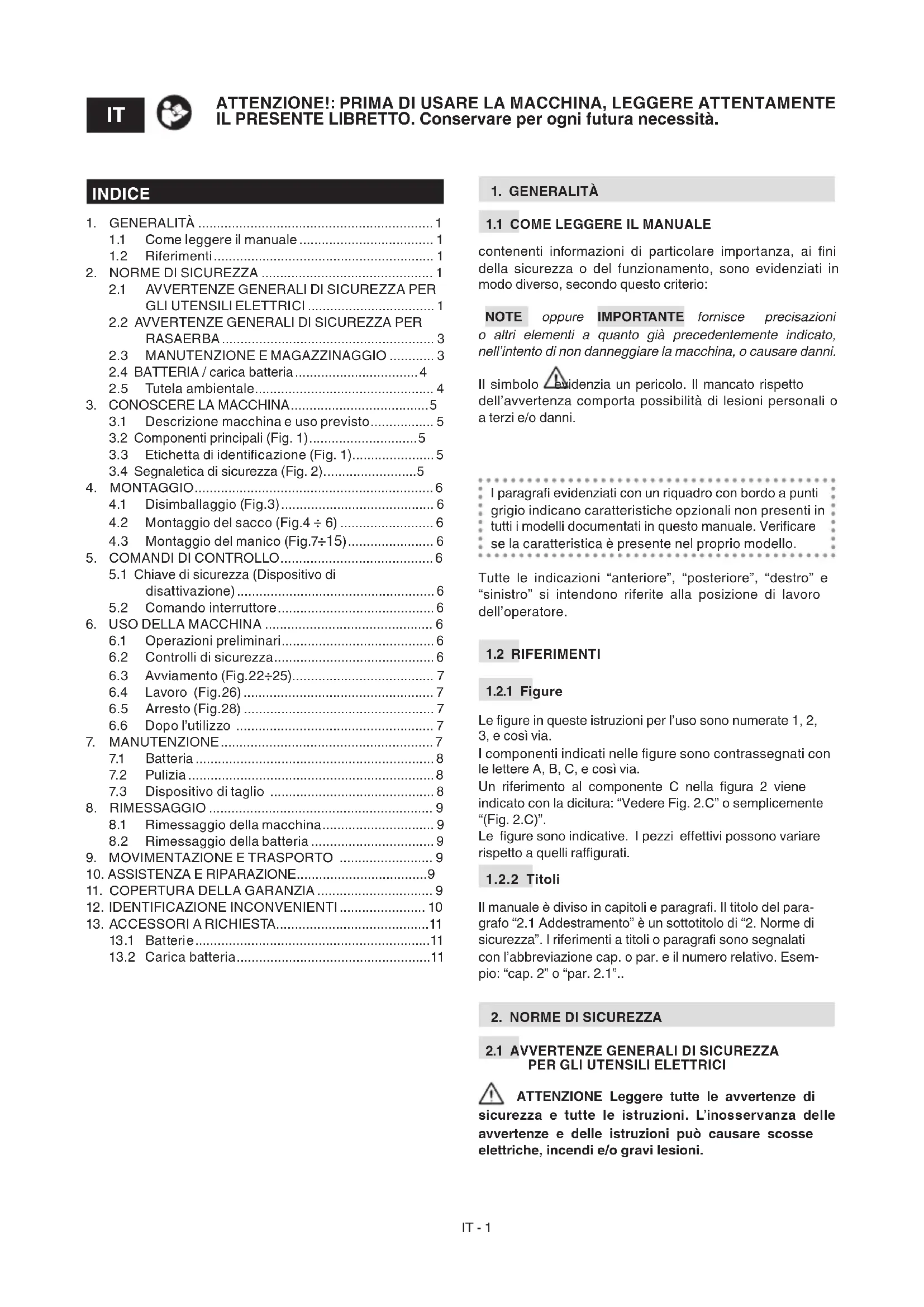 Un dispositivo di taglio mal alato strappa l’erba e provoca un ingiallimento del prato. Non toccare il dispositivo di taglio ntanto che non sia stata tolta la chiave e che il dispositivo di taglio non sia completamente fermo. Fare attenzione che il di- spositivo di taglio può muoversi, anche se la chiave è stata tolta. Tutte le operazioni riguardanti i dispositivi di ta- glio (smontaggio, alatura, equilibratura, riparazione, rimontaggio e/o sostituzione) sono lavori impegnativi che richiedono una specica competenza oltre all’im- piego di apposite attrezzature; per ragioni di sicurezza, occorre pertanto che siano sempre eseguite presso un Centro Specializzato. Far sostituire sempre il dispositivo di taglio dan- neggiato, storto o usurato, assieme alle proprie viti, per mantenere l’equilibratura.IT - 9 IMPORTANTE Utilizzare sempre dispositivi di taglio originali, riportanti il codice indicato nella tabella “Dati Tecnici”. Data l’evoluzione del prodotto, i dispositivi di taglio citati nella tabella “Dati Tecnici” potrebbero essere sostituiti nel tempo da altri, con caratteristiche analoghe di intercambiabilità e sicurezza di funzionamento.