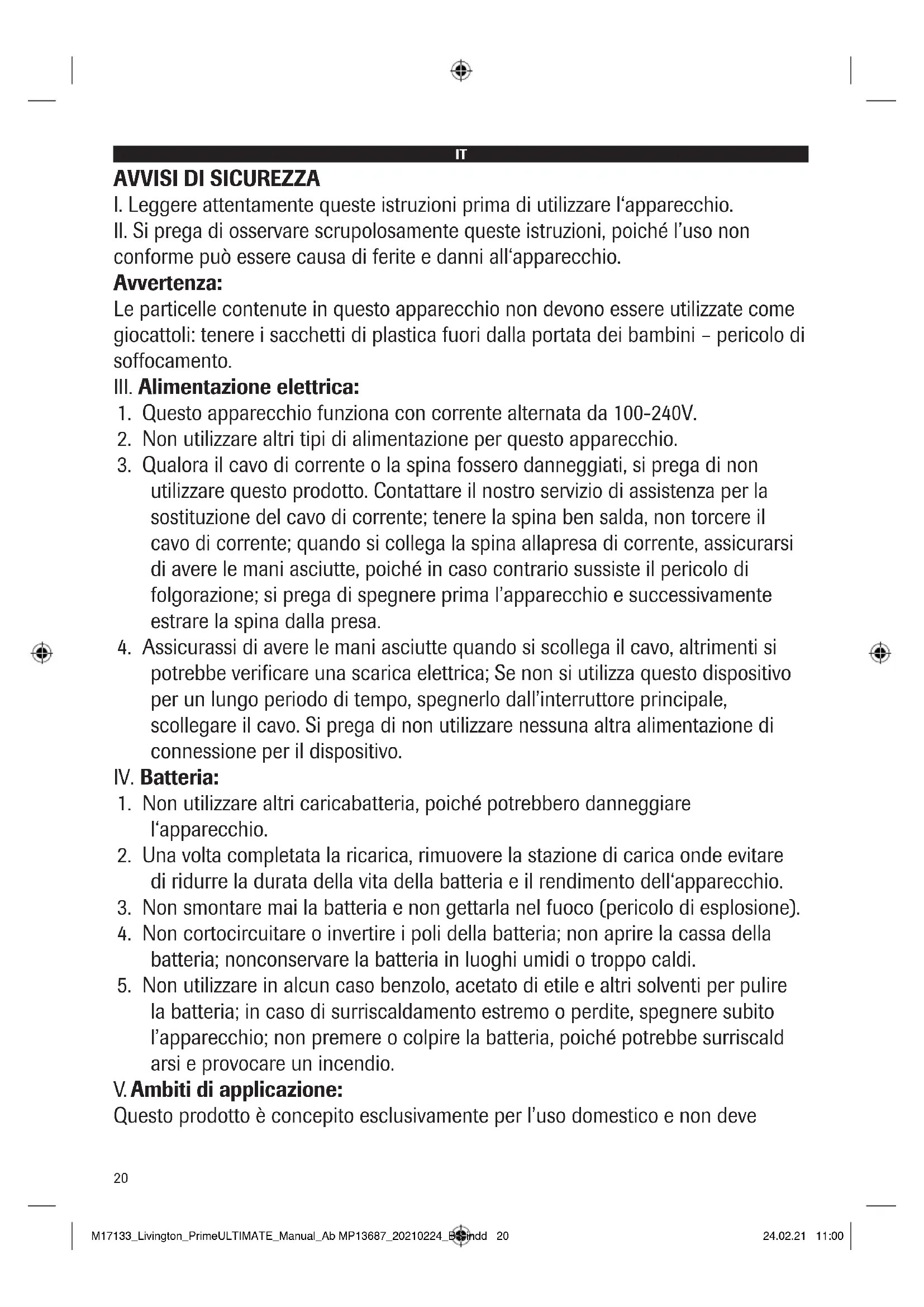 Questo prodotto è concepito esclusivamente per l’uso domestico e non deve M17133_Livington_PrimeULTIMATE_Manual_Ab MP13687_20210224_BS.indd 20M17133_Livington_PrimeULTIMATE_Manual_Ab MP13687_20210224_BS.indd 20 24.02.21 11:0024.02.21 11:0021 essere utilizzato all’aperto o per uso industriale; non è consentito l’uso su capi di abbigliamento, dita, testa o capelli. Il presente è un apparecchio elettrico: onde evitare di danneggiarlo, tenere l’apparecchio lontano da acqua o altri liquidi (ad es. bagni, cucine ecc.). Non aspirare mai dei liquidi. Non utilizzare l’apparecchio in ambienti pericolosi, ad esempio in prossimità di impianti a gas, cisterne di combustibile, prodotti chimici e altre sostanze infiammabili ed esplosive; quest’apparecchio non è concepito per raccogliere cenere, sigarette accese o fiammiferi – pericolo di incendio. Non utilizzare questo prodotto per rimuovere liquidi infiammabili o volatili come benzina, cherosene, vernice, detergente, alcool, profumo, moquette, detergente per pavimenti ecc.. Non utilizzare questo prodotto per rimuovere la polvere di vernice o il toner nella stampante laser o nella fotocopiatrice per evitare incendi o esplosioni.