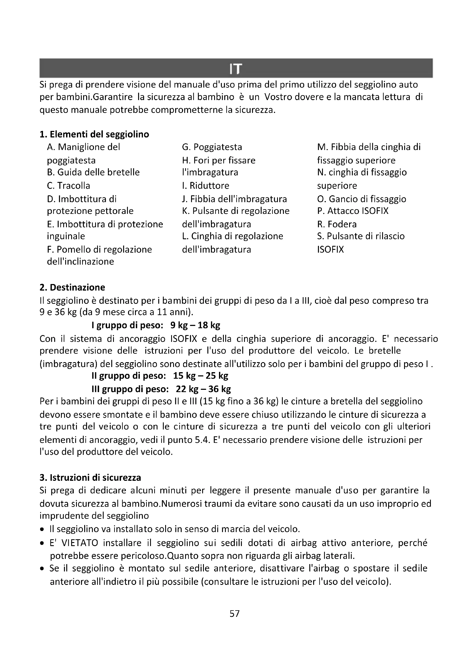- Si raccomanda di conservare il manuale d'uso del seggiolino durante l'intero periodo del suo utilizzo.