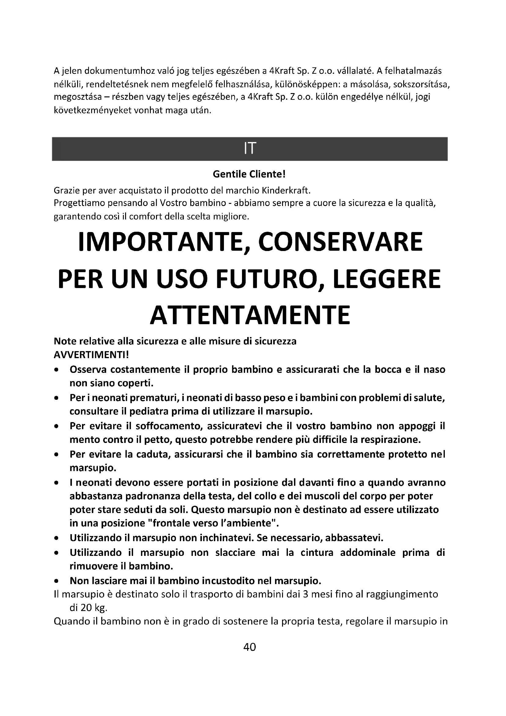 Gentile Cliente! Grazie per aver acquistato il prodotto del marchio Kinderkraft. Progettiamo pensando al Vostro bambino - abbiamo sempre a cuore la sicurezza e la qualità, garantendo così il comfort della scelta migliore. IMPORTANTE, CONSERVARE