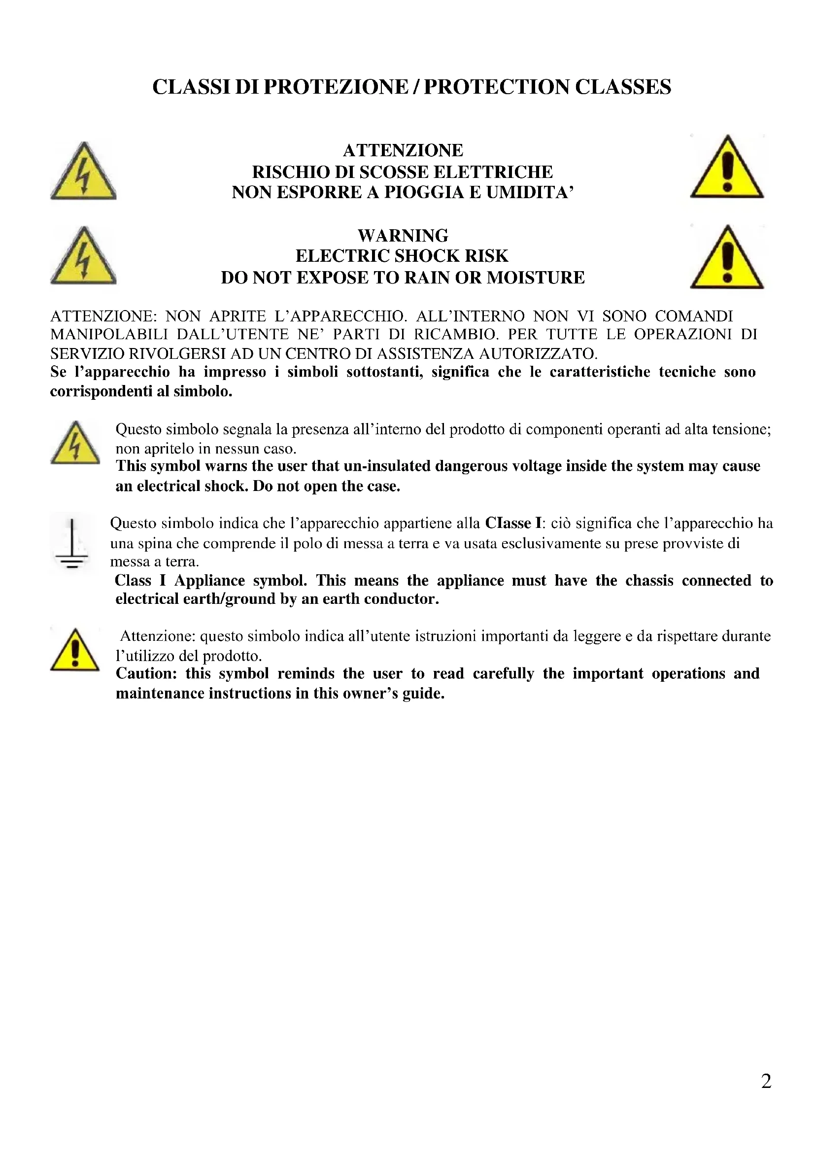 DO NOT EXPOSE TO RAIN OR MOISTURE ATTENZIONE: NON APRITE L’APPARECCHIO. ALL’INTERNO NON VI SONO COMANDI MANIPOLABILI DALL’UTENTE NE’ PARTI DI RICAMBIO. PER TUTTE LE OPERAZIONI DI SERVIZIO RIVOLGERSI AD UN CENTRO DI ASSISTENZA AUTORIZZATO. Se l’apparecchio ha impresso i simboli sottostanti, significa che le caratteristiche tecniche sono corrispondenti al simbolo. Questo simbolo segnala la presenza all’interno del prodotto di componenti operanti ad alta tensione; non apritelo in nessun caso. This symbol warns the user that un-insulated dangerous voltage inside the system may cause an electrical shock. Do not open the case. Questo simbolo indica che l’apparecchio appartiene alla CIasse I: ciò significa che l’apparecchio ha una spina che comprende il polo di messa a terra e va usata esclusivamente su prese provviste di messa a terra. Class I Appliance symbol. This means the appliance must have the chassis connected to electrical earth/ground by an earth conductor. Attenzione: questo simbolo indica all’utente istruzioni importanti da leggere e da rispettare durante l’utilizzo del prodotto. Caution: this symbol reminds the user to read carefully the important operations and maintenance instructions in this owner’s guide.3