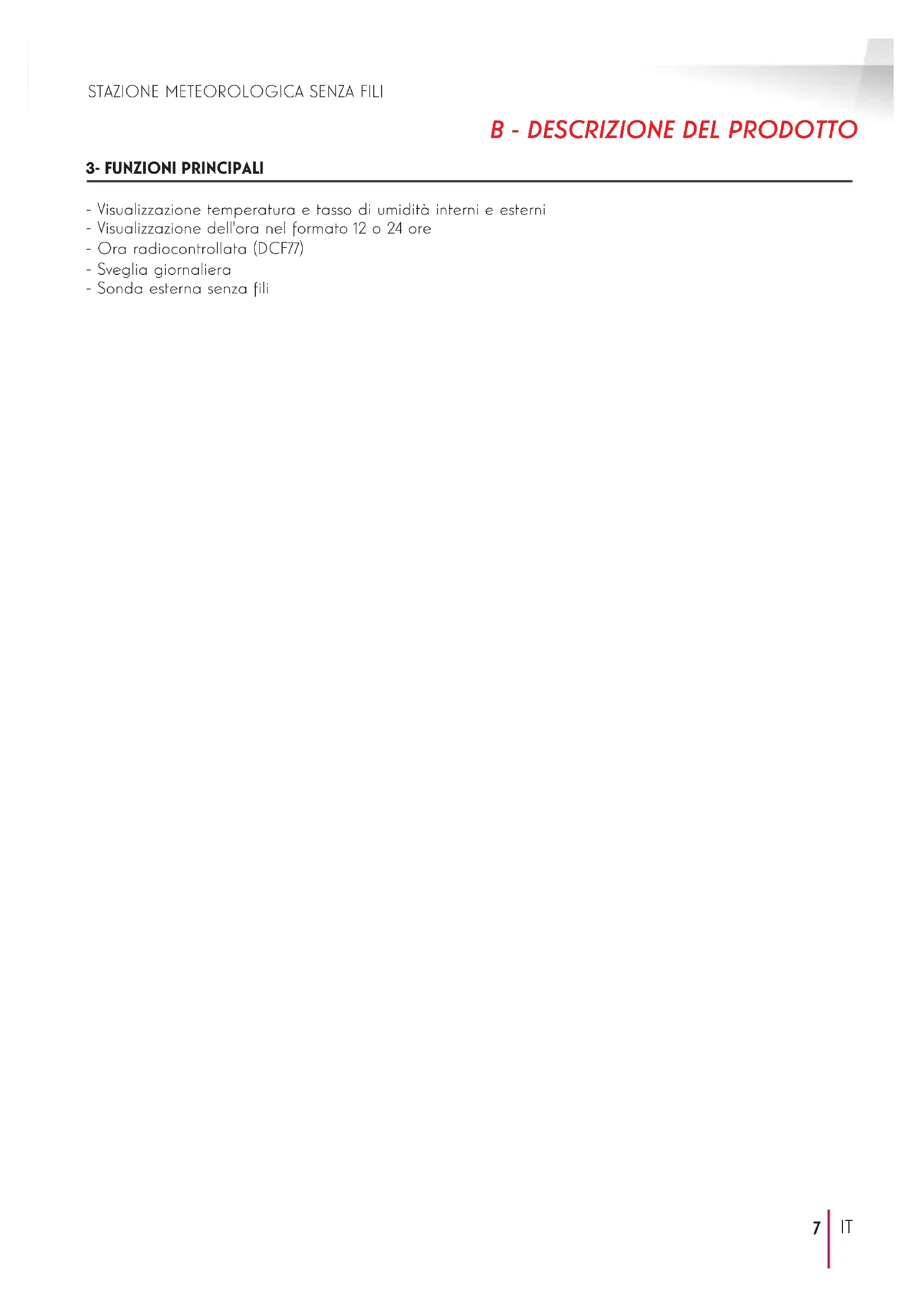 - Visualizzazione temperatura e tasso di umidità interni e esterni - Visualizzazione dell'ora nel formato 12 o 24 ore - Ora radiocontrollata (DCF77) - Sveglia giornaliera - Sonda esterna senza liSTAZIONE METEOROLOGICA SENZA FILI