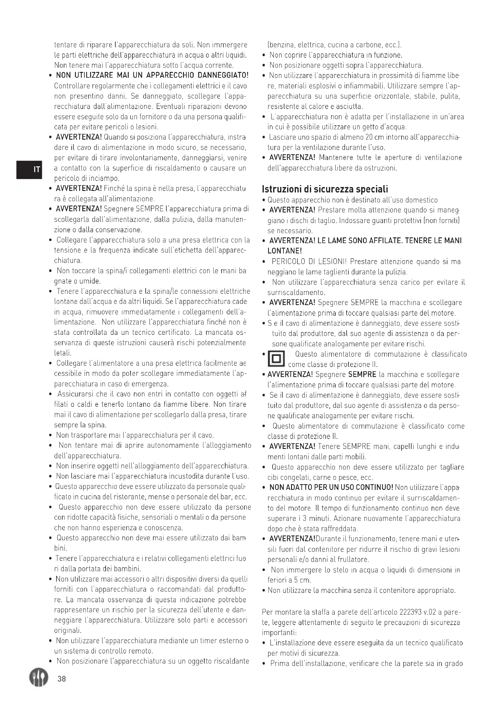- Non utilizzare la macchina senza il contenitore appropriato. Per montare la staffa a parete dell’articolo 222393 v.02 a pare- te, leggere attentamente di seguito le precauzioni di sicurezza importanti: