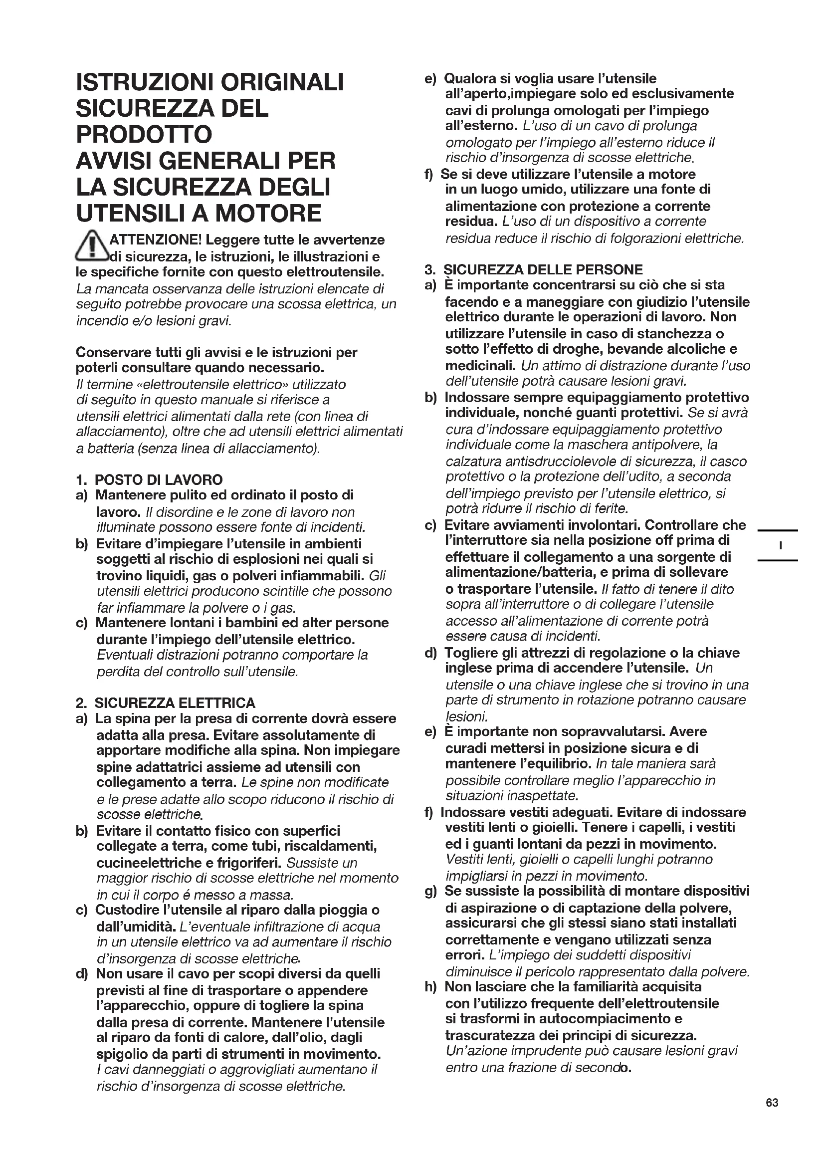 ATTENZIONE! Leggere tutte le avvertenze di sicurezza, le istruzioni, le illustrazioni e le specifiche fornite con questo elettroutensile. La mancata osservanza delle istruzioni elencate di seguito potrebbe provocare una scossa elettrica, un incendio e/o lesioni gravi. Conservare tutti gli avvisi e le istruzioni per poterli consultare quando necessario. Il termine «elettroutensile elettrico» utilizzato di seguito in questo manuale si riferisce a utensili elettrici alimentati dalla rete (con linea di allacciamento), oltre che ad utensili elettrici alimentati a batteria (senza linea di allacciamento).