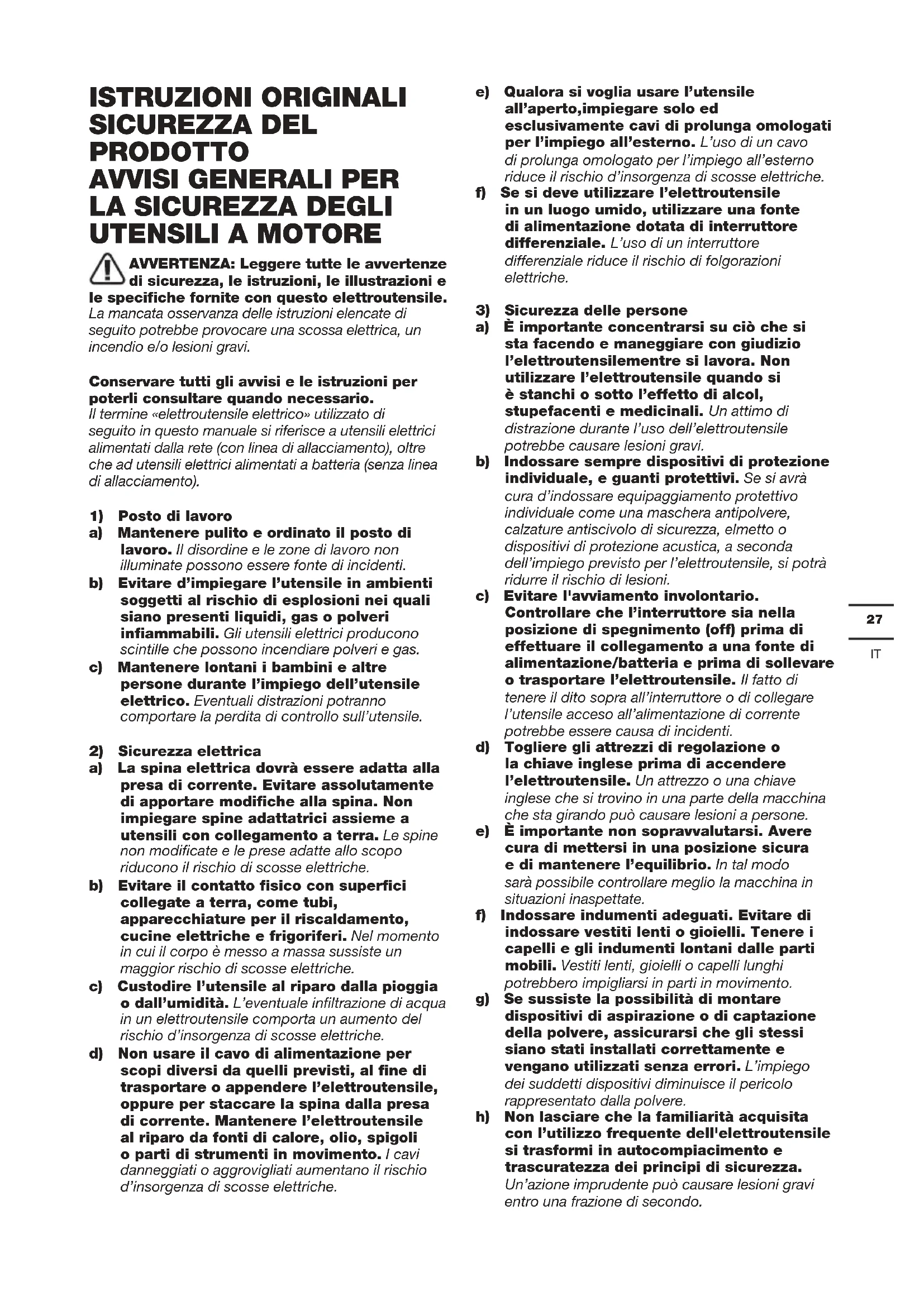 AVVERTENZA: Leggere tutte le avvertenze di sicurezza, le istruzioni, le illustrazioni e le specifiche fornite con questo elettroutensile. La mancata osservanza delle istruzioni elencate di seguito potrebbe provocare una scossa elettrica, un incendio e/o lesioni gravi. Conservare tutti gli avvisi e le istruzioni per poterli consultare quando necessario. Il termine «elettroutensile elettrico» utilizzato di seguito in questo manuale si riferisce a utensili elettrici alimentati dalla rete (con linea di allacciamento), oltre che ad utensili elettrici alimentati a batteria (senza linea di allacciamento).
