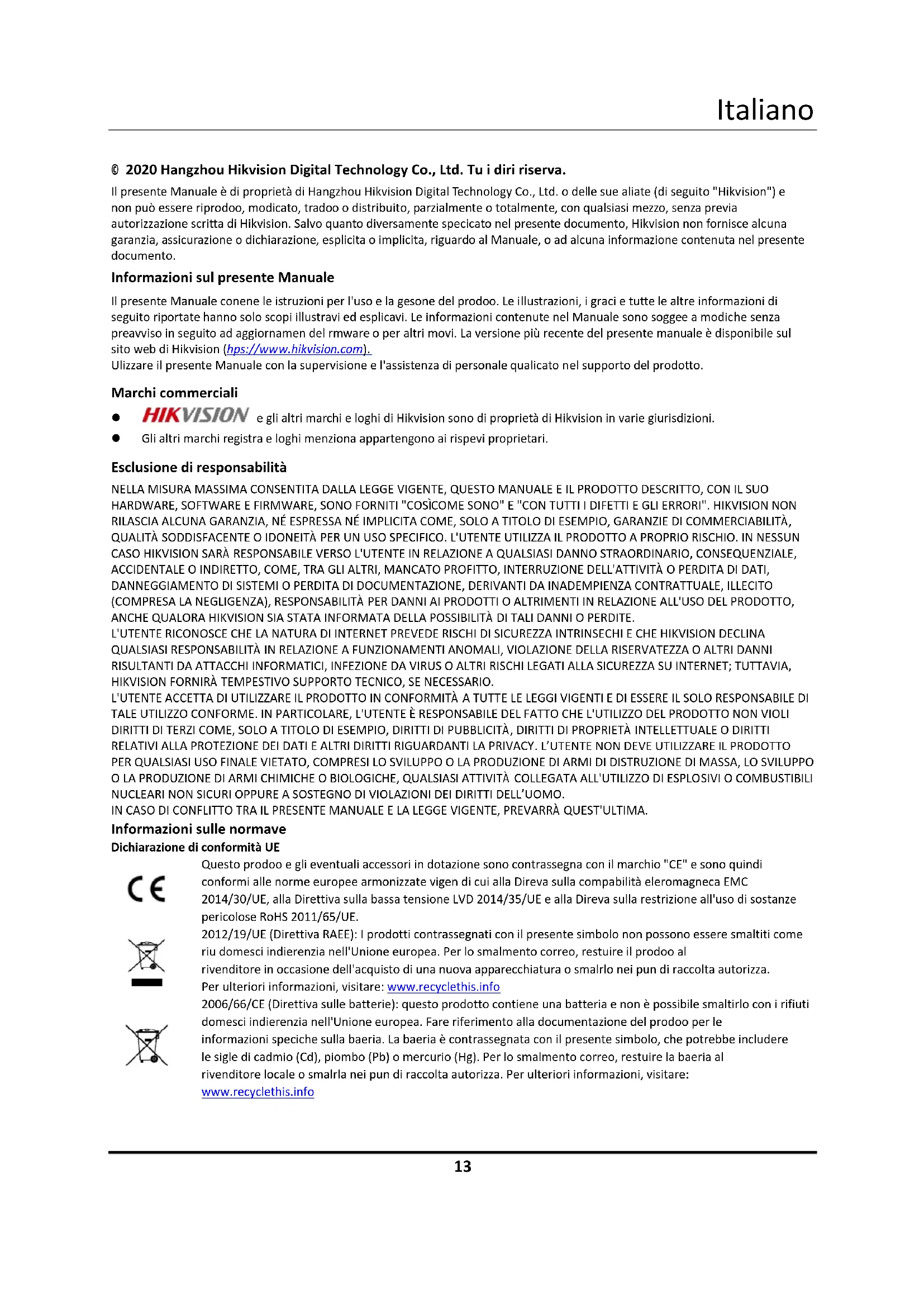© 2020 Hangzhou Hikvision Digital Technology Co., Ltd. Tutti i diritti riservati. Il presente Manuale è di proprietà di Hangzhou Hikvision Digital Technology Co., Ltd. o delle sue affiliate (di seguito "Hikvision") e non può essere riprodotto, modificato, tradotto o distribuito, parzialmente o totalmente, con qualsiasi mezzo, senza previa autorizzazione scritta di Hikvision. Salvo quanto diversamente specificato nel presente documento, Hikvision non fornisce alcuna garanzia, assicurazione o dichiarazione, esplicita o implicita, riguardo al Manuale, o ad alcuna informazione contenuta nel presente documento. Informazioni sul presente Manuale Il presente Manuale contiene le istruzioni per l'uso e la gestione del prodotto. Le illustrazioni, i grafici e tutte le altre informazioni di seguito riportate hanno solo scopi illustrativi ed esplicativi. Le informazioni contenute nel Manuale sono soggette a modifiche senza preavviso in seguito ad aggiornamenti del firmware o per altri motivi. La versione più recente del presente manuale è disponibile sul sito web di Hikvision (http s://www.hikvision.com). Utilizzare il presente Manuale con la supervisione e l'assistenza di personale qualificato nel supporto del prodotto. Marchi commerciali e gli altri marchi e loghi di Hikvision sono di proprietà di Hikvision in varie giurisdizioni. Gli altri marchi registrati e loghi menzionati appartengono ai rispettivi proprietari. Esclusione di responsabilità NELLA MISURA MASSIMA CONSENTITA DALLA LEGGE VIGENTE, QUESTO MANUALE E IL PRODOTTO DESCRITTO, CON IL SUO HARDWARE, SOFTWARE E FIRMWARE, SONO FORNITI "COSÌ COME SONO" E "CON TUTTI I DIFETTI E GLI ERRORI". HIKVISION NON RILASCIA ALCUNA GARANZIA, NÉ ESPRESSA NÉ IMPLICITA COME, SOLO A TITOLO DI ESEMPIO, GARANZIE DI COMMERCIABILITÀ, QUALITÀ SODDISFACENTE O IDONEITÀ PER UN USO SPECIFICO. L'UTENTE UTILIZZA IL PRODOTTO A PROPRIO RISCHIO. IN NESSUN CASO HIKVISION SARÀ RESPONSABILE VERSO L'UTENTE IN RELAZIONE A QUALSIASI DANNO STRAORDINARIO, CONSEQUENZIALE, ACCIDENTALE O INDIRETTO, COME, TRA GLI ALTRI, MANCATO PROFITTO, INTERRUZIONE DELL'ATTIVITÀ O PERDITA DI DATI, DANNEGGIAMENTO DI SISTEMI O PERDITA DI DOCUMENTAZIONE, DERIVANTI DA INADEMPIENZA CONTRATTUALE, ILLECITO (COMPRESA LA NEGLIGENZA), RESPONSABILITÀ PER DANNI AI PRODOTTI O ALTRIMENTI IN RELAZIONE ALL'USO DEL PRODOTTO, ANCHE QUALORA HIKVISION SIA STATA INFORMATA DELLA POSSIBILITÀ DI TALI DANNI O PERDITE. L'UTENTE RICONOSCE CHE LA NATURA DI INTERNET PREVEDE RISCHI DI SICUREZZA INTRINSECHI E CHE HIKVISION DECLINA QUALSIASI RESPONSABILITÀ IN RELAZIONE A FUNZIONAMENTI ANOMALI, VIOLAZIONE DELLA RISERVATEZZA O ALTRI DANNI RISULTANTI DA ATTACCHI INFORMATICI, INFEZIONE DA VIRUS O ALTRI RISCHI LEGATI ALLA SICUREZZA SU INTERNET; TUTTAVIA, HIKVISION FORNIRÀ TEMPESTIVO SUPPORTO TECNICO, SE NECESSARIO. L'UTENTE ACCETTA DI UTILIZZARE IL PRODOTTO IN CONFORMITÀ A TUTTE LE LEGGI VIGENTI E DI ESSERE IL SOLO RESPONSABILE DI TALE UTILIZZO CONFORME. IN PARTICOLARE, L'UTENTE È RESPONSABILE DEL FATTO CHE L'UTILIZZO DEL PRODOTTO NON VIOLI DIRITTI DI TERZI COME, SOLO A TITOLO DI ESEMPIO, DIRITTI DI PUBBLICITÀ, DIRITTI DI PROPRIETÀ INTELLETTUALE O DIRITTI RELATIVI ALLA PROTEZIONE DEI DATI E ALTRI DIRITTI RIGUARDANTI LA PRIVACY. L’UTENTE NON DEVE UTILIZZARE IL PRODOTTO PER QUALSIASI USO FINALE VIETATO, COMPRESI LO SVILUPPO O LA PRODUZIONE DI ARMI DI DISTRUZIONE DI MASSA, LO SVILUPPO O LA PRODUZIONE DI ARMI CHIMICHE O BIOLOGICHE, QUALSIASI ATTIVITÀ COLLEGATA ALL'UTILIZZO DI ESPLOSIVI O COMBUSTIBILI NUCLEARI NON SICURI OPPURE A SOSTEGNO DI VIOLAZIONI DEI DIRITTI DELL’UOMO. IN CASO DI CONFLITTO TRA IL PRESENTE MANUALE E LA LEGGE VIGENTE, PREVARRÀ QUEST'ULTIMA. Informazioni sulle normative Dichiarazione di conformità UE