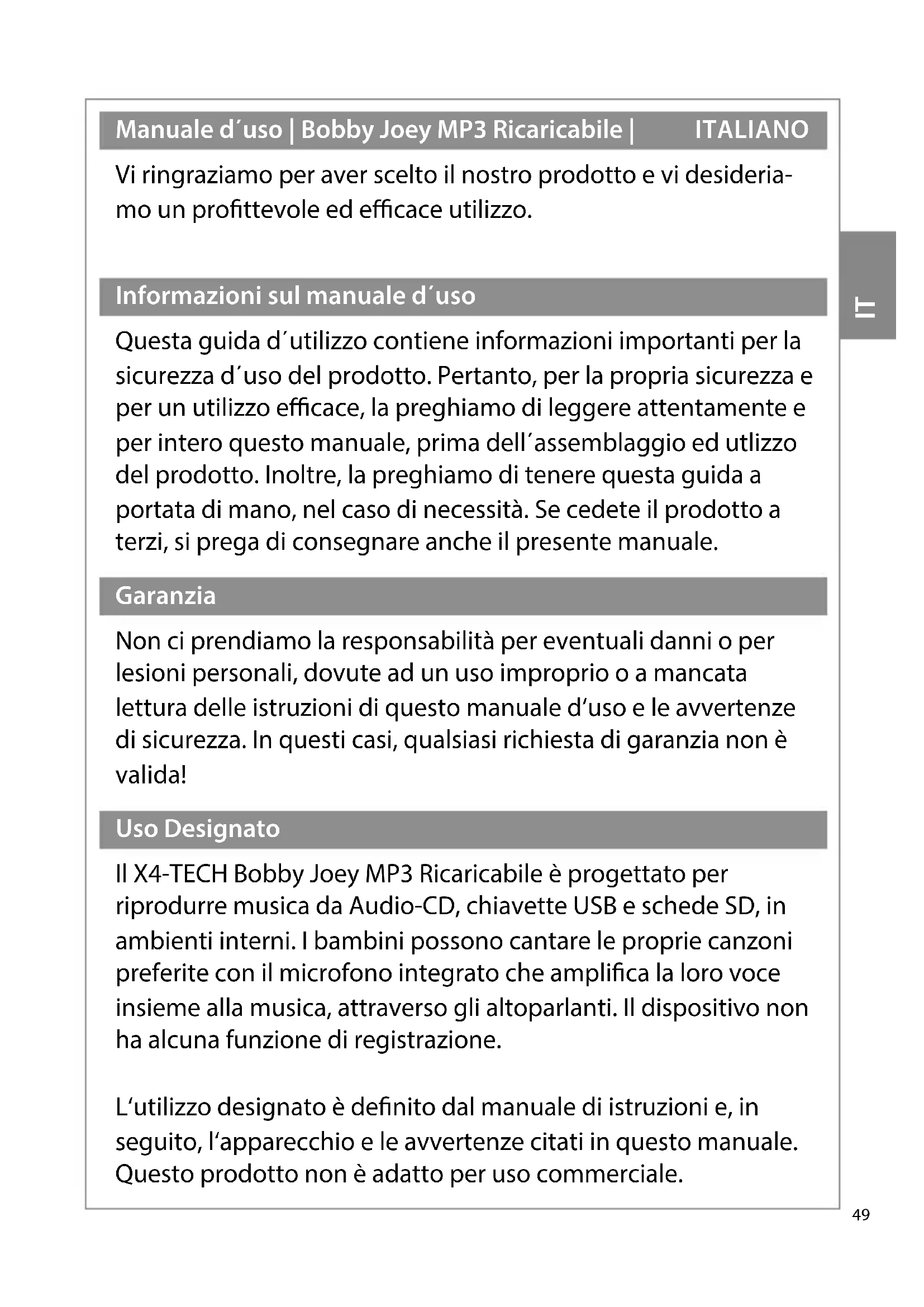 EN48 EN lived non food GmbH lived non food GmbH, all rights reserved. No liability will be taken for modications or mistakes regarding the technical data or product features described in this user manual. All rights reserved. Any reproduction, transfer, duplication or ling of this user manual or parts of it, as well as the translation into a foreign language or computer language is prohibited without the explicit approval of the manufacturer. Due to the fast advancement of these products, no guarantee of completeness can be given. Modications in technique and conguration are subject to change at any time. To receive a digital copy of this user manual, please contact our service department. Guarantee and service conditions You receive a voluntary 2-year manufacturer guarantee, starting at purchase date, for material and production defects of the product. This guarantee is applicable in Germany, Austria and Switzerland. The receipt counts as a proof of guarantee. Within the guarantee period we will repair all material and manufacturer defects free of charge. Your statutory warranties remains unaected by this guarantee. The guarantee does not count: – in case of damages which have arisen after improper use – for wear parts / accessories that are subject to natural wear and tear – for defects that are known to the customer at purchase – in case of damages that occurred due to repair or intervention of the buyer or an unauthorized third party – in case the device was connected to a higher voltage as stated on the device – when dropping the device or single elements of it – for improper transportation or packaging – damages that occurred due to force majeure – for non-observance of valid safety precautions – for non-observance of the manual Batteries / rechargeable batteries are not covered by the guarantee as they are parts of consumption. Spare part: X4-TECH replacement rechargeable battery for children CD player Bobby Joey MP3 rechargeable Art. 701482 In case of a guarantee claim, the date of sale has to be proven by receipt or invoice. Replacements for reasons covered by the guarantee do not lead to an extension of the original guarantee period, neither for the device itself nor for any replaced components. If you are claiming a valid guarantee, we are entitled to choose whether we will repair the device free of charge or exchange it for a new device. Any further claims are excluded. Parts replaced will pass into our property. We reserve the right to change defective parts or products against follow-up models. Please always contact us before you return your product. Provided that a return shipment has been agreed upon, send the defective product securely packaged at your own cost to our service department. It is absolutely necessary that you add a copy of your receipt to your return shipment. Repairs carried out after the guarantee period are subject to a charge. We will not accept freight collect shipments and will return them to the sender.IT Manuale d΄uso | Bobby Joey MP3 Ricaricabile | ITALIANO Vi ringraziamo per aver scelto il nostro prodotto e vi desideria- mo un prottevole ed ecace utilizzo. Informazioni sul manuale d΄uso Questa guida d΄utilizzo contiene informazioni importanti per la sicurezza d΄uso del prodotto. Pertanto, per la propria sicurezza e per un utilizzo ecace, la preghiamo di leggere attentamente e per intero questo manuale, prima dell΄assemblaggio ed utlizzo del prodotto. Inoltre, la preghiamo di tenere questa guida a portata di mano, nel caso di necessità. Se cedete il prodotto a terzi, si prega di consegnare anche il presente manuale. Garanzia Non ci prendiamo la responsabilità per eventuali danni o per lesioni personali, dovute ad un uso improprio o a mancata lettura delle istruzioni di questo manuale d‘uso e le avvertenze di sicurezza. In questi casi, qualsiasi richiesta di garanzia non è valida! Uso Designato Il X4-TECH Bobby Joey MP3 Ricaricabile è progettato per riprodurre musica da Audio-CD, chiavette USB e schede SD, in ambienti interni. I bambini possono cantare le proprie canzoni preferite con il microfono integrato che amplica la loro voce insieme alla musica, attraverso gli altoparlanti. Il dispositivo non ha alcuna funzione di registrazione. L‘utilizzo designato è denito dal manuale di istruzioni e, in seguito, l‘apparecchio e le avvertenze citati in questo manuale. Questo prodotto non è adatto per uso commerciale. 49Note generali Tutte le società menzionate e i nomi dei prodotti sono marchi registrati sotto i diritti dei loro proprietari. © Tutti i diritti riservati. Non saranno prese passività per danni derivanti dalla non lettura e / o dal non seguire il manuale d‘uso e / o di qualsiasi forma di modica sul o nel prodotto. In queste circostanze, non ci sarà nessun servizio di garanzia. In questi casi, la garanzia non sarà valida e nessuna responsabilità sarà presa. Il contenuto di questo manuale potrebbe dierire dal prodotto. Se così fosse, si prega di consultare i manuali aggiuntivi nella confezione. Tenere questo manuale in un luogo sicuro. Se questo prodotto è trasmesso a terzi, assicurarsi che sia accompa- gnato dal manuale d‘uso. Per motivi di sicurezza e CE-licensing, non è consentito modi- care questa unità in qualsiasi modo e / o utilizzarlo per funzioni diverse dalla destinazione d‘uso.