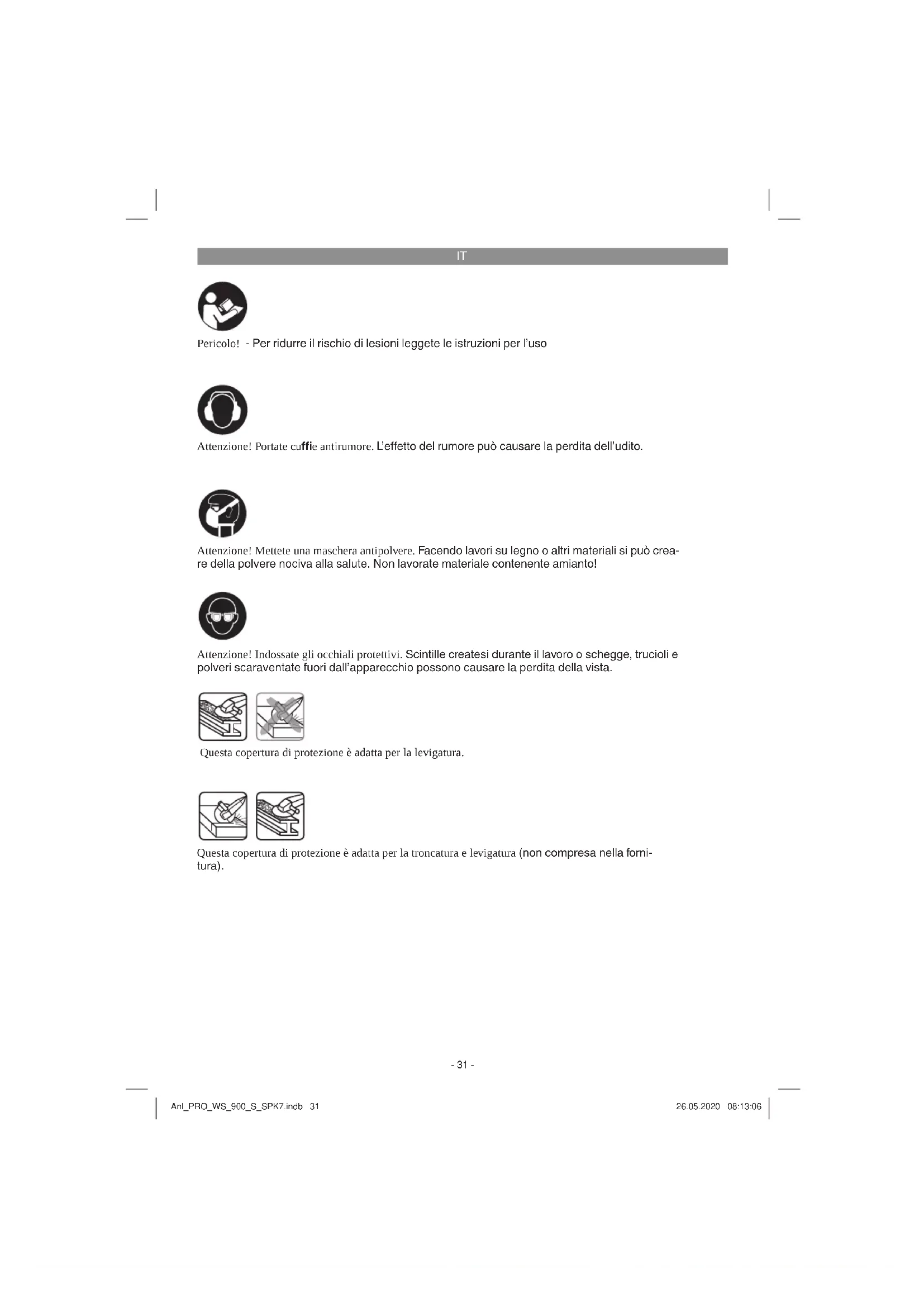 Pericolo! - Per ridurre il rischio di lesioni leggete le istruzioni per l’uso Attenzione! Portate cuffi e antirumore. L’ e ff etto del rumore può causare la perdita dell’udito. Attenzione! Indossate gli occhiali protettivi. Scintille createsi durante il lavoro o schegge, trucioli e polveri scaraventate fuori dall’apparecchio possono causare la perdita della vista. Attenzione! Mettete una maschera antipolvere. Facendo lavori su legno o altri materiali si può crea- re della polvere nociva alla salute. Non lavorate materiale contenente amianto! Questa copertura di protezione è adatta per la troncatura e levigatura (non compresa nella forni- tura). Questa copertura di protezione è adatta per la levigatura. Anl_PRO_WS_900_S_SPK7.indb 31Anl_PRO_WS_900_S_SPK7.indb 31 26.05.2020 08:13:0626.05.2020 08:13:06IT