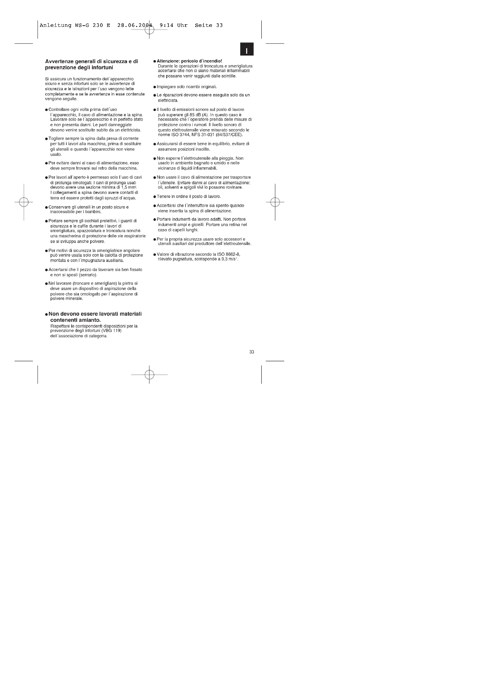 Durante le operazioni di troncatura e smerigliatura accertarsi che non ci sono materiali inflammabili che possano venir raggiunti dalle scintille.