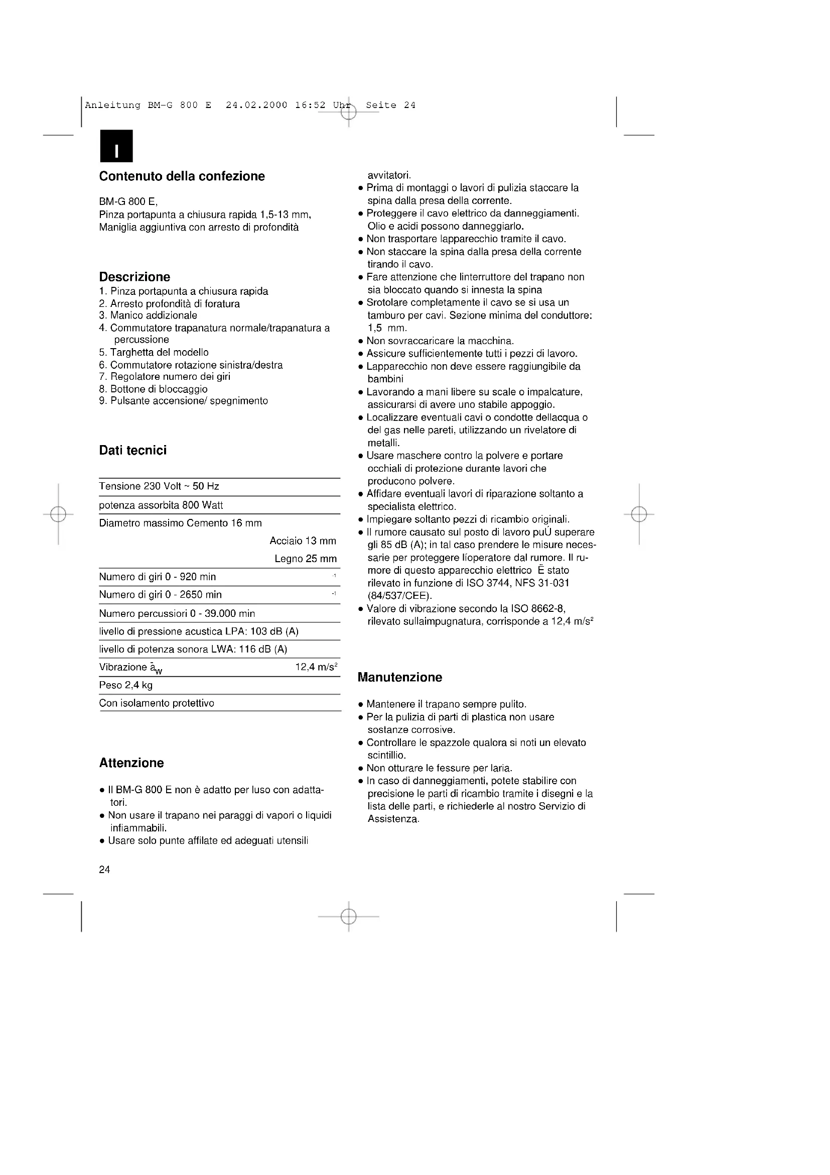 Peso 2,4 kg Con isolamento protettivo Attenzione ● Il BM-G 800 E non è adatto per luso con adatta- tori. ● Non usare il trapano nei paraggi di vapori o liquidi infiammabili. ● Usare solo punte affilate ed adeguati utensili avvitatori. ● Prima di montaggi o lavori di pulizia staccare la spina dalla presa della corrente. ● Proteggere il cavo elettrico da danneggiamenti. Olio e acidi possono danneggiarlo. ● Non trasportare lapparecchio tramite il cavo. ● Non staccare la spina dalla presa della corrente tirando il cavo. ● Fare attenzione che linterruttore del trapano non sia bloccato quando si innesta la spina ● Srotolare completamente il cavo se si usa un tamburo per cavi. Sezione minima del conduttore: 1,5 mm. ● Non sovraccaricare la macchina. ● Assicure sufficientemente tutti i pezzi di lavoro. ● Lapparecchio non deve essere raggiungibile da bambini ● Lavorando a mani libere su scale o impalcature, assicurarsi di avere uno stabile appoggio. ● Localizzare eventuali cavi o condotte dellacqua o del gas nelle pareti, utilizzando un rivelatore di metalli. ● Usare maschere contro la polvere e portare occhiali di protezione durante lavori che producono polvere. ● Affidare eventuali lavori di riparazione soltanto a specialista elettrico. ● Impiegare soltanto pezzi di ricambio originali. ● Il rumore causato sul posto di lavoro puÚ superare gli 85 dB (A); in tal caso prendere le misure neces- sarie per proteggere líoperatore dal rumore. Il ru- more di questo apparecchio elettrico Ë stato rilevato in funzione di ISO 3744, NFS 31-031 (84/537/CEE). ● Valore di vibrazione secondo la ISO 8662-8, rilevato sullaimpugnatura, corrisponde a 12,4 m/s