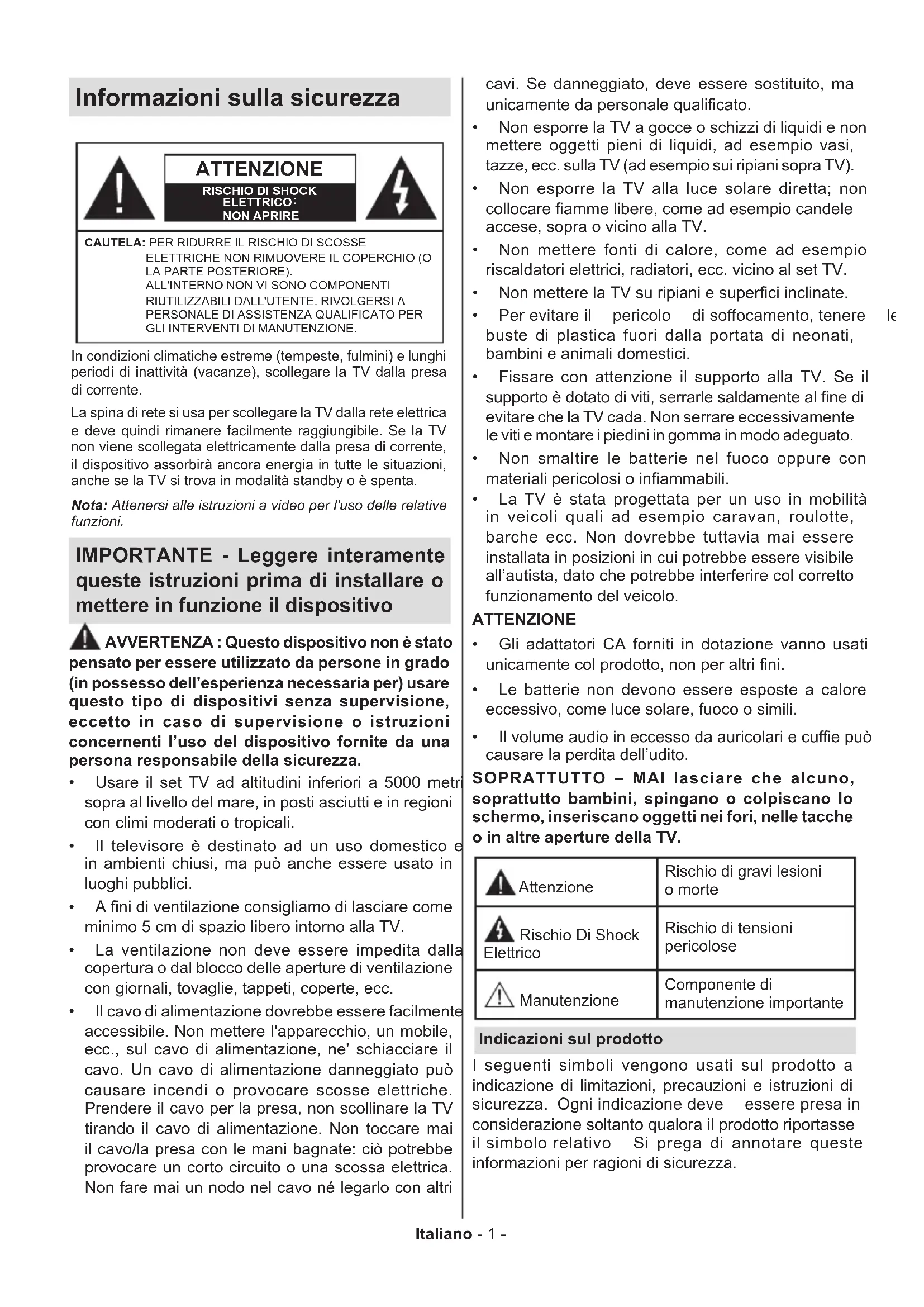 NON APRIRECAUTELA: PER RIDURRE IL RISCHIO DI SCOSSE ELETTRICHE NON RIMUOVERE IL COPERCHIO (O LA PARTE POSTERIORE). ALL'INTERNO NON VI SONO COMPONENTI RIUTILIZZABILI DALL'UTENTE. RIVOLGERSI A PERSONALE DI ASSISTENZA QUALIFICATO PER GLI INTERVENTI DI MANUTENZIONE.Nota: Attenersi alle istruzioni a video per l'uso delle relative funzioni.In condizioni climatiche estreme (tempeste, fulmini) e lunghi periodi di inattività (vacanze), scollegare la TV dalla presa di corrente.La spina di rete si usa per scollegare la TV dalla rete elettrica e deve quindi rimanere facilmente raggiungibile. Se la TV non viene scollegata elettricamente dalla presa di corrente, il dispositivo assorbirà ancora energia in tutte le situazioni, anche se la TV si trova in modalità standby o è spenta. IMPORTANTE - Leggere interamente queste istruzioni prima di installare o mettere in funzione il dispositivo AVVERTENZA : Questo dispositivo non è stato pensato per essere utilizzato da persone in grado (in possesso dell’esperienza necessaria per) usare questo tipo di dispositivi senza supervisione, eccetto in caso di supervisione o istruzioni concernenti l’uso del dispositivo fornite da una persona responsabile della sicurezza. Usare il set TV ad altitudini inferiori a 5000 metri sopra al livello del mare, in posti asciutti e in regioni con climi moderati o tropicali. Il televisore è destinato ad un uso domestico e in ambienti chiusi, ma può anche essere usato in luoghi pubblici.