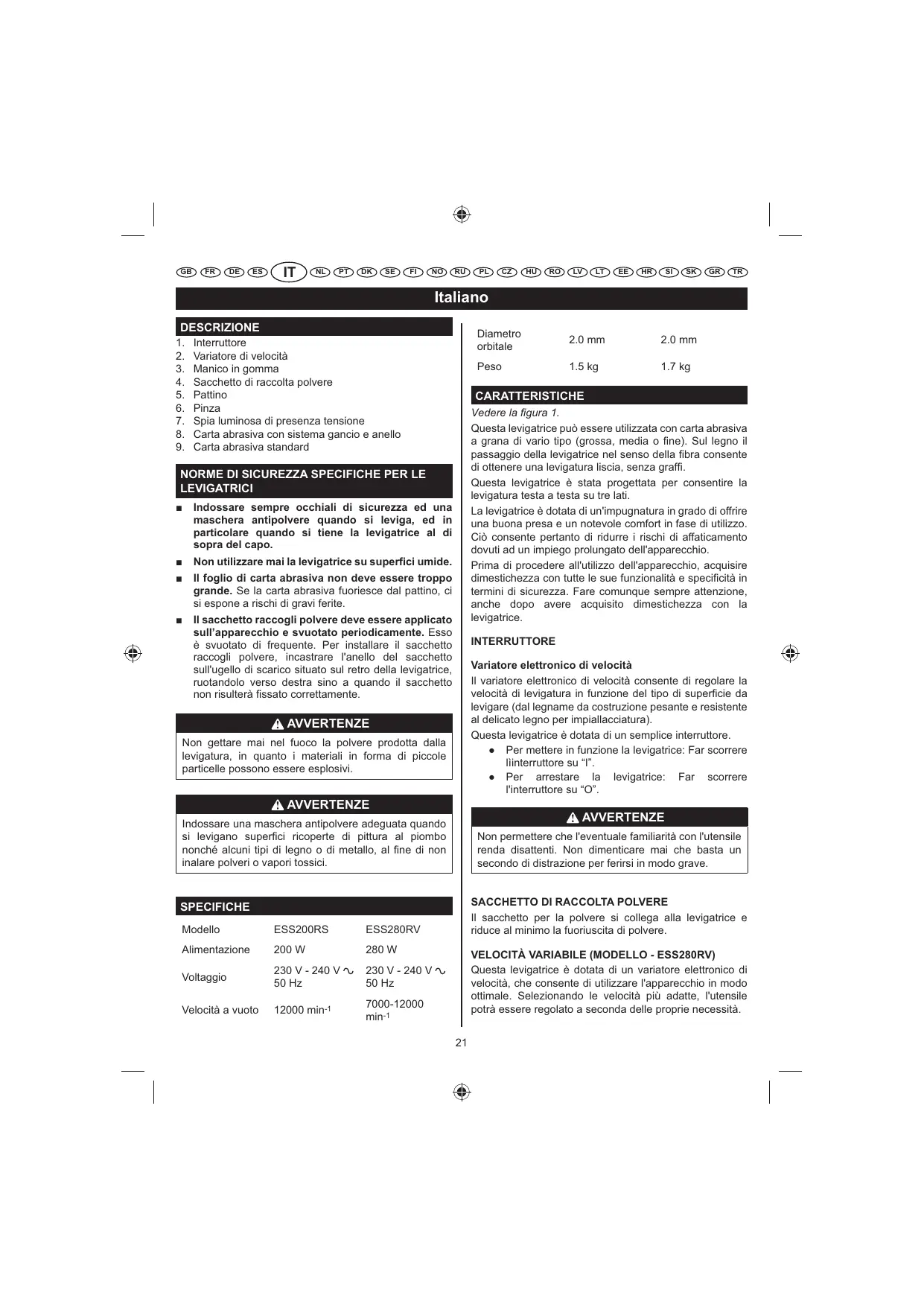 Il sacchetto per la polvere si collega alla levigatrice e riduce al minimo la fuoriuscita di polvere. SPECIFICHE Modello ESS200RS ESS280RV Alimentazione 200 W 280 W Voltaggio 230 V - 240 V 50 Hz 230 V - 240 V 50 Hz Velocità a vuoto 12000 min-1 7000-12000 min-1 VELOCITÀ VARIABILE (MODELLO - ESS280RV) Questa levigatrice è dotata di un variatore elettronico di velocità, che consente di utilizzare l'apparecchio in modo ottimale. Selezionando le velocità più adatte, l'utensile potrà essere regolato a seconda delle proprie necessità.