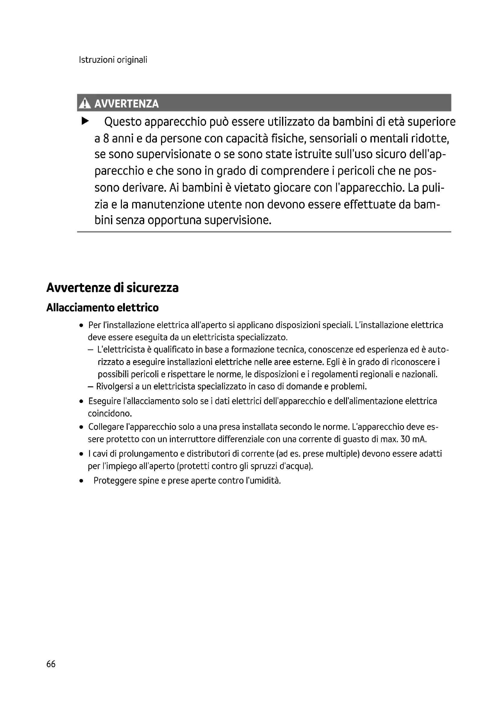 AVVISO AVVERTENZA Questo apparecchio può essere utilizzato da bambini di età superiore a 8 anni e da persone con capacità fisiche, sensoriali o mentali ridotte, se sono supervisionate o se sono state istruite sull'uso sicuro dell'ap- parecchio e che sono in grado di comprendere i pericoli che ne pos- sono derivare. Ai bambini è vietato giocare con l'apparecchio. La puli- zia e la manutenzione utente non devono essere effettuate da bam- bini senza opportuna supervisione. Avvertenze di sicurezza Allacciamento elettrico Per l'installazione elettrica all'aperto si applicano disposizioni speciali. L’installazione elettrica deve essere eseguita da un elettricista specializzato. – L'elettricista è qualificato in base a formazione tecnica, conoscenze ed esperienza ed è auto- rizzato a eseguire installazioni elettriche nelle aree esterne. Egli è in grado di riconoscere i possibili pericoli e rispettare le norme, le disposizioni e i regolamenti regionali e nazionali. – Rivolgersi a un elettricista specializzato in caso di domande e problemi. Eseguire l'allacciamento solo se i dati elettrici dell'apparecchio e dell'alimentazione elettrica coincidono. Collegare l'apparecchio solo a una presa installata secondo le norme. L'apparecchio deve es- sere protetto con un interruttore differenziale con una corrente di guasto di max. 30 mA. I cavi di prolungamento e distributori di corrente (ad es. prese multiple) devono essere adatti per l'impiego all'aperto (protetti contro gli spruzzi d'acqua). Proteggere spine e prese aperte contro l'umidità.IT