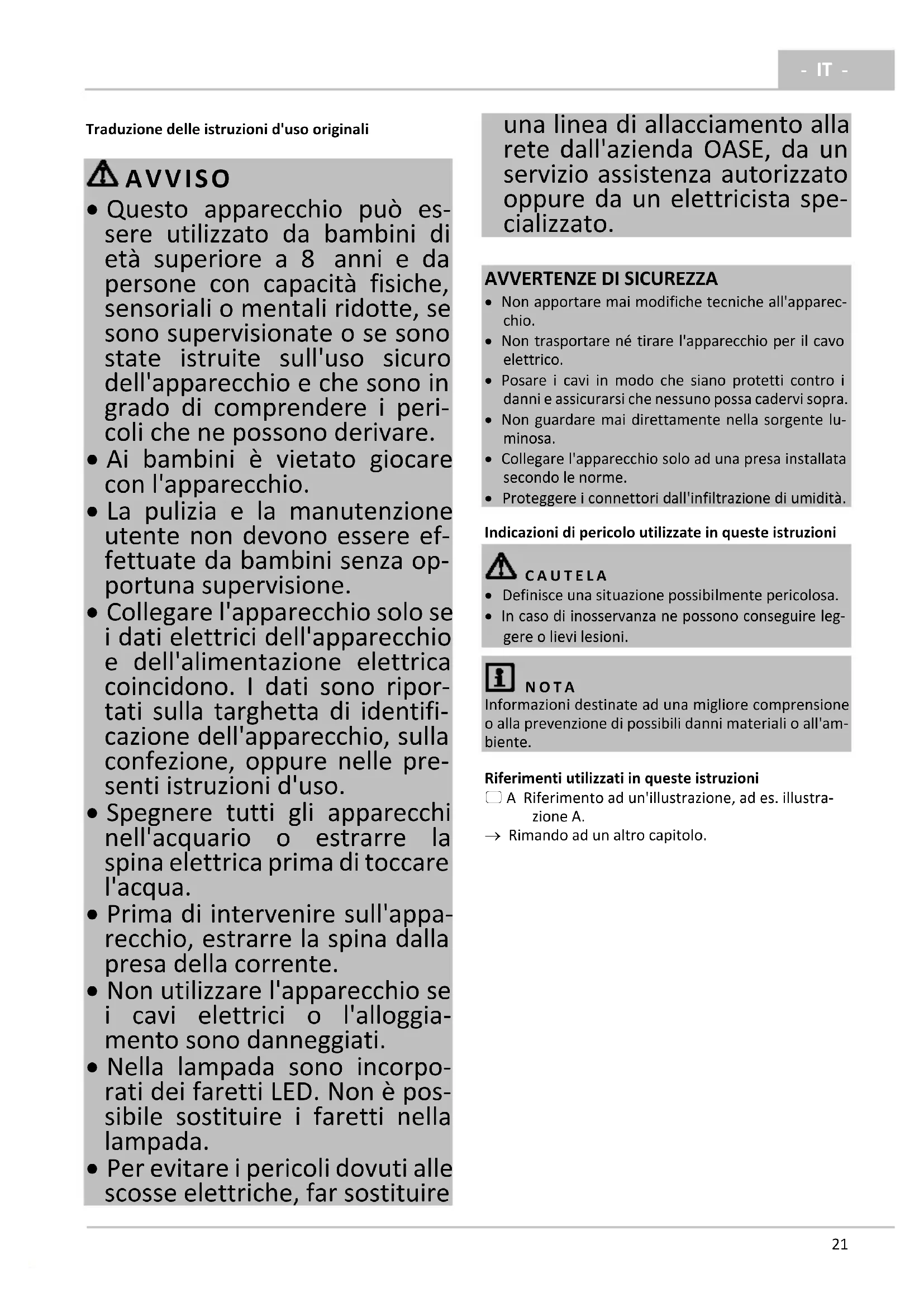 - Per evitare i pericoli dovuti alle scosse elettriche, far sostituire una linea di allacciamento alla rete dall'azienda OASE, da un servizio assistenza autorizzato oppure da un elettricista spe- cializzato.