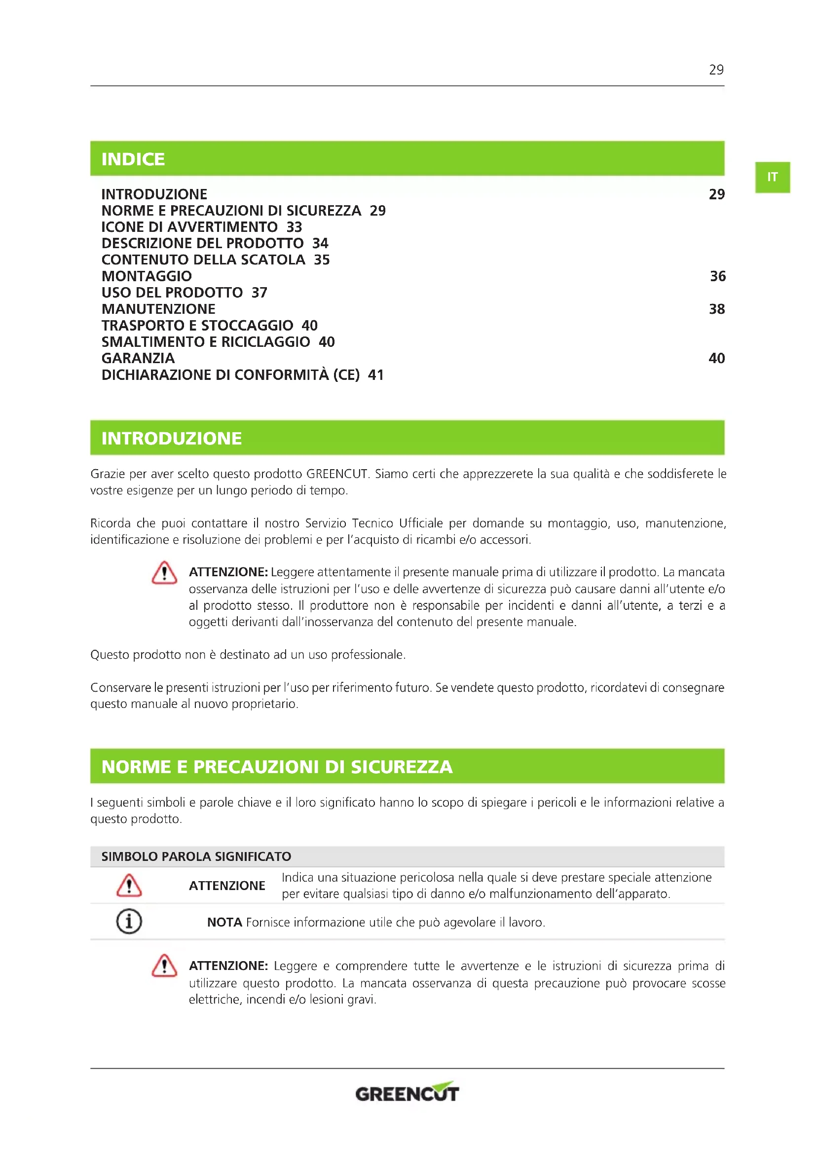INTRODUZIONE Grazie per aver scelto questo prodotto GREENCUT. Siamo certi che apprezzerete la sua qualità e che soddisferete le vostre esigenze per un lungo periodo di tempo. Ricorda che puoi contattare il nostro Servizio Tecnico Ufciale per domande su montaggio, uso, manutenzione, identicazione e risoluzione dei problemi e per l’acquisto di ricambi e/o accessori. ATTENZIONE: Leggere attentamente il presente manuale prima di utilizzare il prodotto. La mancata osservanza delle istruzioni per l’uso e delle avvertenze di sicurezza può causare danni all’utente e/o al prodotto stesso. Il produttore non è responsabile per incidenti e danni all’utente, a terzi e a oggetti derivanti dall’inosservanza del contenuto del presente manuale. Questo prodotto non è destinato ad un uso professionale. Conservare le presenti istruzioni per l’uso per riferimento futuro. Se vendete questo prodotto, ricordatevi di consegnare questo manuale al nuovo proprietario.