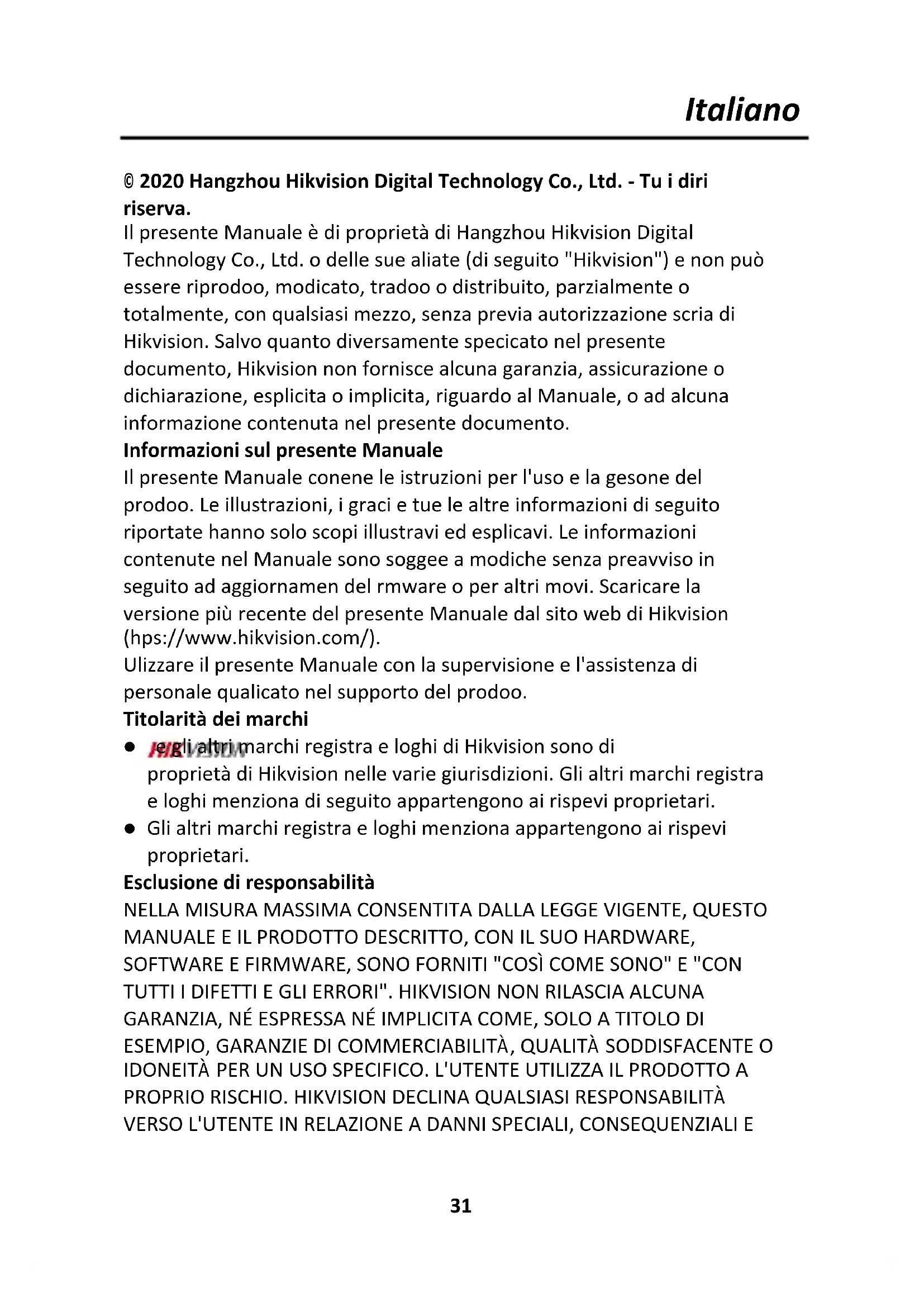 © 2020 Hangzhou Hikvision Digital Technology Co., Ltd. - Tutti i diritti riservati. Il presente Manuale è di proprietà di Hangzhou Hikvision Digital Technology Co., Ltd. o delle sue affiliate (di seguito "Hikvision") e non può essere riprodotto, modificato, tradotto o distribuito, parzialmente o totalmente, con qualsiasi mezzo, senza previa autorizzazione scritta di Hikvision. Salvo quanto diversamente specificato nel presente documento, Hikvision non fornisce alcuna garanzia, assicurazione o dichiarazione, esplicita o implicita, riguardo al Manuale, o ad alcuna informazione contenuta nel presente documento. Informazioni sul presente Manuale Il presente Manuale contiene le istruzioni per l'uso e la gestione del prodotto. Le illustrazioni, i grafici e tutte le altre informazioni di seguito riportate hanno solo scopi illustrativi ed esplicativi. Le informazioni contenute nel Manuale sono soggette a modifiche senza preavviso in seguito ad aggiornamenti del firmware o per altri motivi. Scaricare la versione più recente del presente Manuale dal sito web di Hikvision (https://www.hikvision.com/). Utilizzare il presente Manuale con la supervisione e l'assistenza di personale qualificato nel supporto del prodotto. Titolarità dei marchi e gli altri marchi registrati e loghi di Hikvision sono di proprietà di Hikvision nelle varie giurisdizioni. Gli altri marchi registrati e loghi menzionati di seguito appartengono ai rispettivi proprietari. Gli altri marchi registrati e loghi menzionati appartengono ai rispettivi proprietari. Esclusione di responsabilità NELLA MISURA MASSIMA CONSENTITA DALLA LEGGE VIGENTE, QUESTO MANUALE E IL PRODOTTO DESCRITTO, CON IL SUO HARDWARE, SOFTWARE E FIRMWARE, SONO FORNITI "COSÌ COME SONO" E "CON TUTTI I DIFETTI E GLI ERRORI". HIKVISION NON RILASCIA ALCUNA GARANZIA, NÉ ESPRESSA NÉ IMPLICITA COME, SOLO A TITOLO DI ESEMPIO, GARANZIE DI COMMERCIABILITÀ, QUALITÀ SODDISFACENTE O IDONEITÀ PER UN USO SPECIFICO. L'UTENTE UTILIZZA IL PRODOTTO A