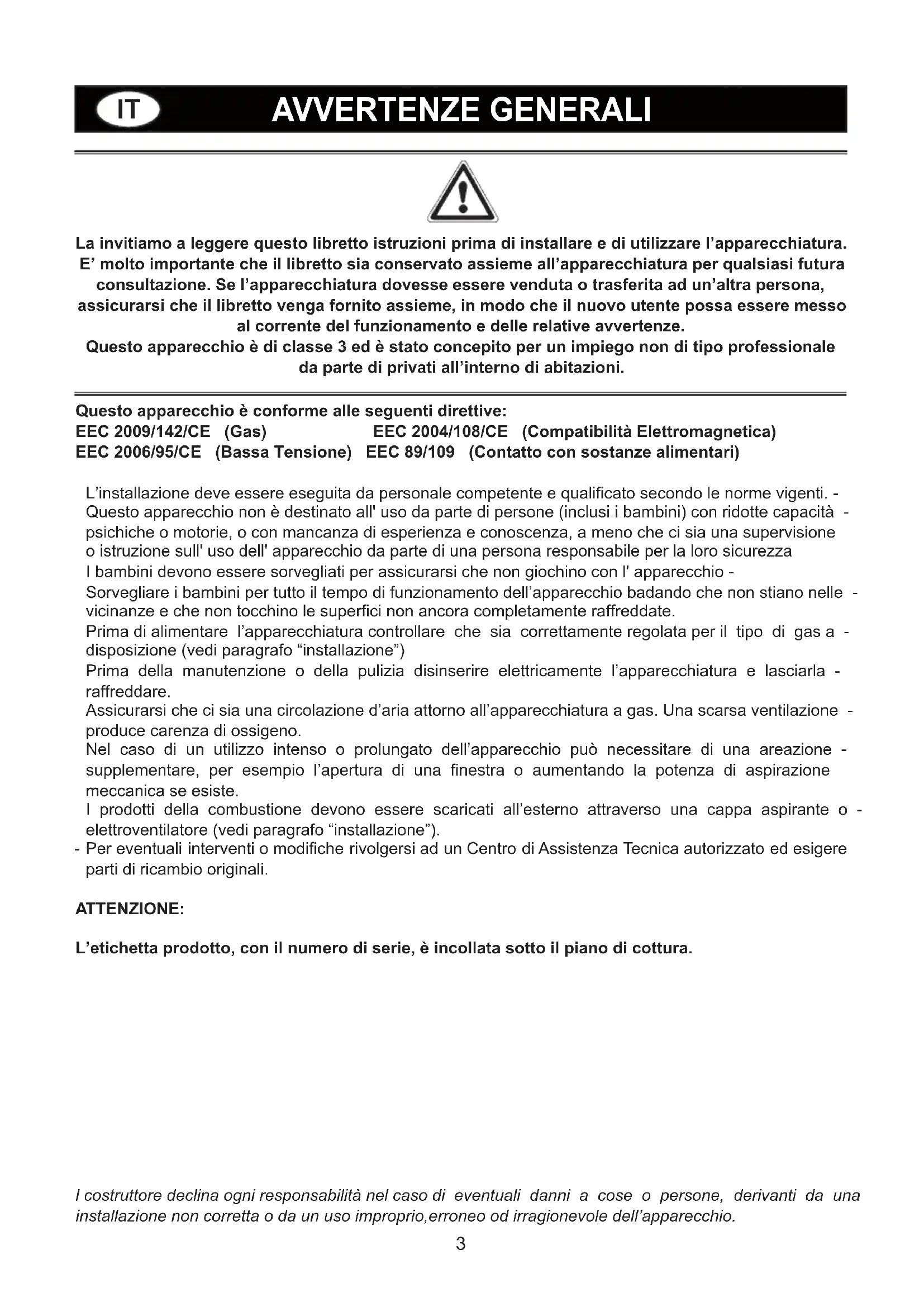 GV755HBK23 l costruttore declina ogni responsabilità nel caso di eventuali danni a cose o persone, derivanti da una installazione non corretta o da un uso improprio,erroneo od irragionevole dell’apparecchio. La invitiamo a leggere questo libretto istruzioni prima di installare e di utilizzare l’apparecchiatura. E’ molto importante che il libretto sia conservato assieme all’apparecchiatura per qualsiasi futura consultazione. Se l’apparecchiatura dovesse essere venduta o trasferita ad un’altra persona, assicurarsi che il libretto venga fornito assieme, in modo che il nuovo utente possa essere messo al corrente del funzionamento e delle relative avvertenze. Questo apparecchio è di classe 3 ed è stato concepito per un impiego non di tipo professionale da parte di privati all’interno di abitazioni. Questo apparecchio è conforme alle seguenti direttive: EEC 2009/142/CE (Gas) EEC 2004/108/CE (Compatibilità Elettromagnetica) EEC 2006/95/CE (Bassa Tensione) EEC 89/109 (Contatto con sostanze alimentari) L’installazione deve essere eseguita da personale competente e qualificato secondo le norme vigenti. - Questo apparecchio non è destinato all' uso da parte di persone (inclusi i bambini) con ridotte capacità - psichiche o motorie, o con mancanza di esperienza e conoscenza, a meno che ci sia una supervisione o istruzione sull' uso dell' apparecchio da parte di una persona responsabile per la loro sicurezza I bambini devono essere sorvegliati per assicurarsi che non giochino con l' apparecchio - Sorvegliare i bambini per tutto il tempo di funzionamento dell’apparecchio badando che non stiano nelle - vicinanze e che non tocchino le superfici non ancora completamente raffreddate. Prima di alimentare l’apparecchiatura controllare che sia correttamente regolata per il tipo di gas a - disposizione (vedi paragrafo “installazione”) Prima della manutenzione o della pulizia disinserire elettricamente l’apparecchiatura e lasciarla - raffreddare. Assicurarsi che ci sia una circolazione d’aria attorno all’apparecchiatura a gas. Una scarsa ventilazione - produce carenza di ossigeno. Nel caso di un utilizzo intenso o prolungato dell’apparecchio può necessitare di una areazione - supplementare, per esempio l’apertura di una finestra o aumentando la potenza di aspirazione meccanica se esiste. I prodotti della combustione devono essere scaricati all’esterno attraverso una cappa aspirante o - elettroventilatore (vedi paragrafo “installazione”). Per eventuali interventi o modifiche rivolgersi ad un Centro di Assistenza Tecnica autorizzato ed esigere - parti di ricambio originali. ATTENZIONE: L’etichetta prodotto, con il numero di serie, è incollata sotto il piano di cottura.