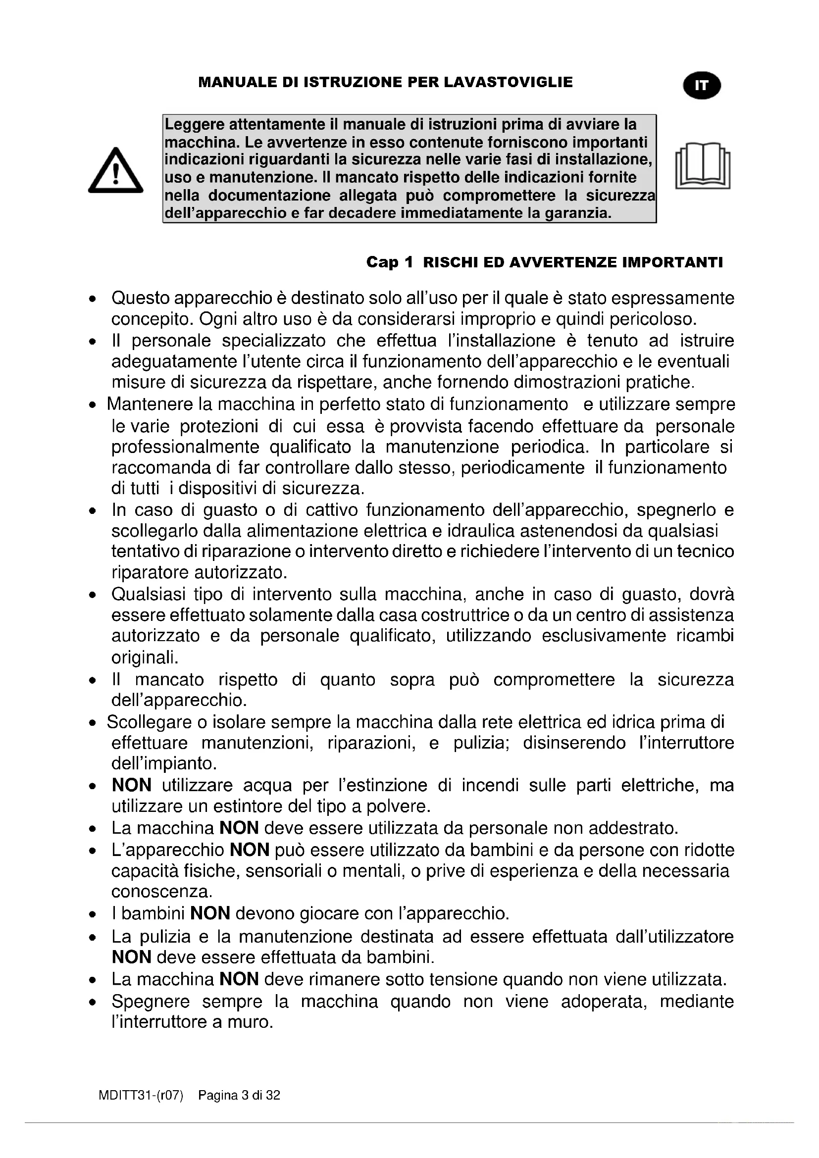 - NON utilizzare dispositivi di dosaggio o altri apparecchi, non previsti dal costruttore capaci di alterare le caratteristiche di sicurezza o funzionalità della macchina.MANUALE DI ISTRUZIONE PER LAVASTOVIGLIE Pagina 6 di 32 MDITT3131-(r07)
