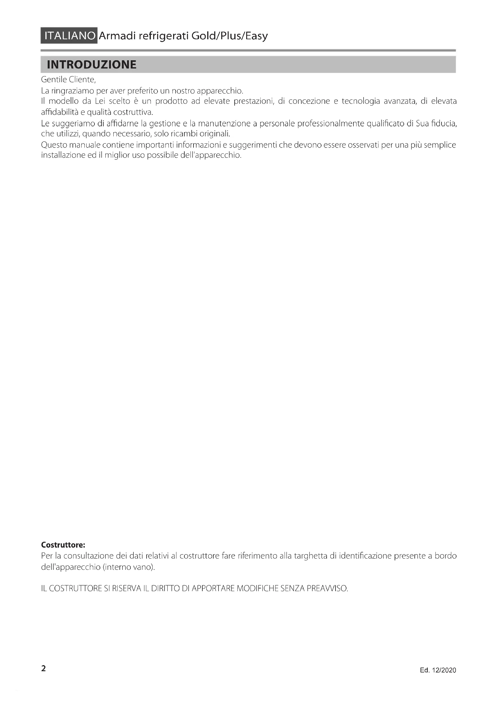 Ed. 12/2020 INTRODUZIONE Gentile Cliente, La ringraziamo per aver preferito un nostro apparecchio. Il modello da Lei scelto è un prodotto ad elevate prestazioni, di concezione e tecnologia avanzata, di elevata affidabilità e qualità costruttiva. Le suggeriamo di affidarne la gestione e la manutenzione a personale professionalmente qualificato di Sua fiducia, che utilizzi, quando necessario, solo ricambi originali. Questo manuale contiene importanti informazioni e suggerimenti che devono essere osservati per una più semplice installazione ed il miglior uso possibile dell'apparecchio. Costruttore: Per la consultazione dei dati relativi al costruttore fare riferimento alla targhetta di identificazione presente a bordo dell'apparecchio (interno vano). IL COSTRUTTORE SI RISERVA IL DIRITTO DI APPORTARE MODIFICHE SENZA PREAVVISO. ITALIANO Armadi refrigerati Gold/Plus/EasyITALIANOArmadi refrigerati Gold/Plus/Easy