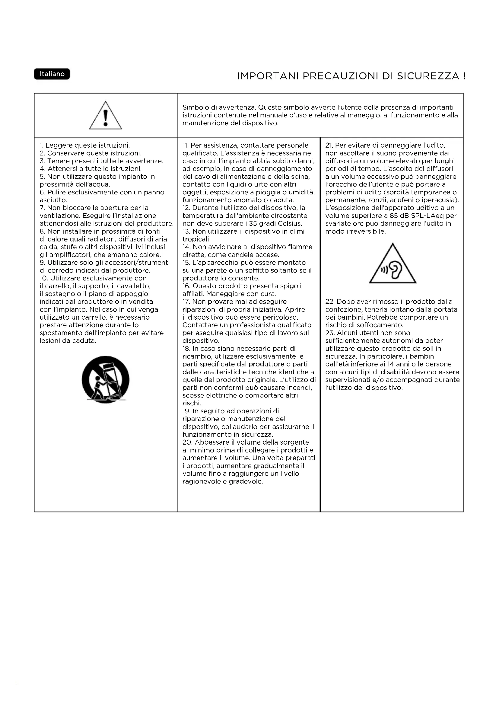 non ascoltare il suono proveniente dai diusori a un volume elevato per lunghi periodi di tempo. L’ascolto dei diusori a un volume eccessivo può danneggiare l’orecchio dell’utente e può portare a problemi di udito (sordità temporanea o permanente, ronzii, acufeni o iperacusia). L’esposizione dell’apparato uditivo a un volume superiore a 85 dB SPL-LAeq per svariate ore può danneggiare l’udito in modo irreversibile.