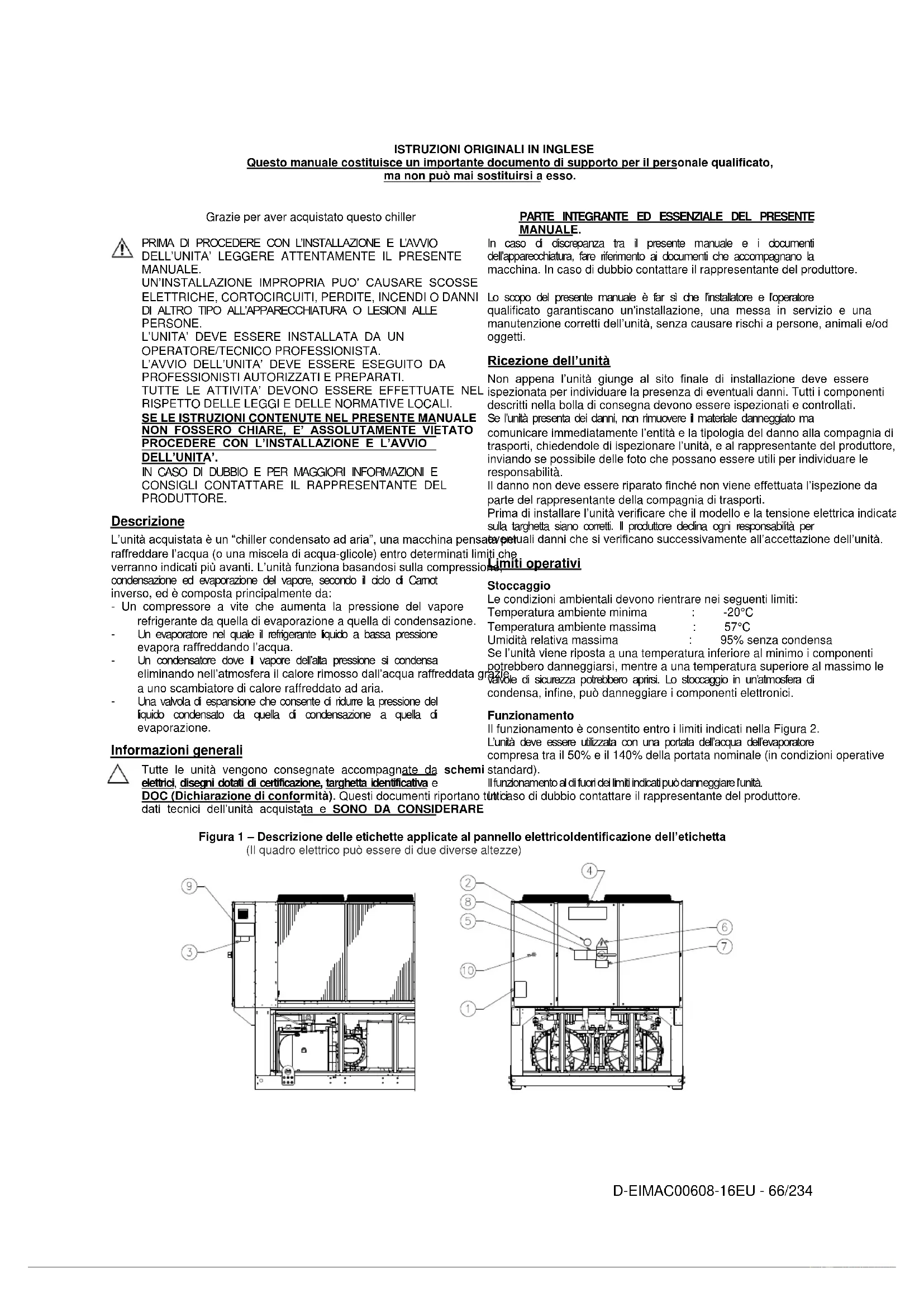portata dell’acqua dell’evaporatore non deve mai essere superiore al 120% né inferiore all’80% della capacità nominale. Controlli obbligatori periodici e avviamento delle apparecchiature sotto pressione Le unità sono incluse nella categoria IV della classificazione stabilita dalla Direttiva Europea 2014/68/UE (PED). Per i gruppi frigoriferi appartenenti a tale categoria, il D.M. n. 329 del 01/12/2004, prescrive che le unità installate sul territorio italiano siano sottoposte, da parte di “soggetti abilitati (ISPESL, USL, ASL)”, a visite periodiche con scadenze triennali. Contattare pertanto uno dei “soggetti abilitati” per chiedere l’autorizzazione alla messa in funzione del gruppo frigorifero.D-EIMAC00608-16EU - 72/234