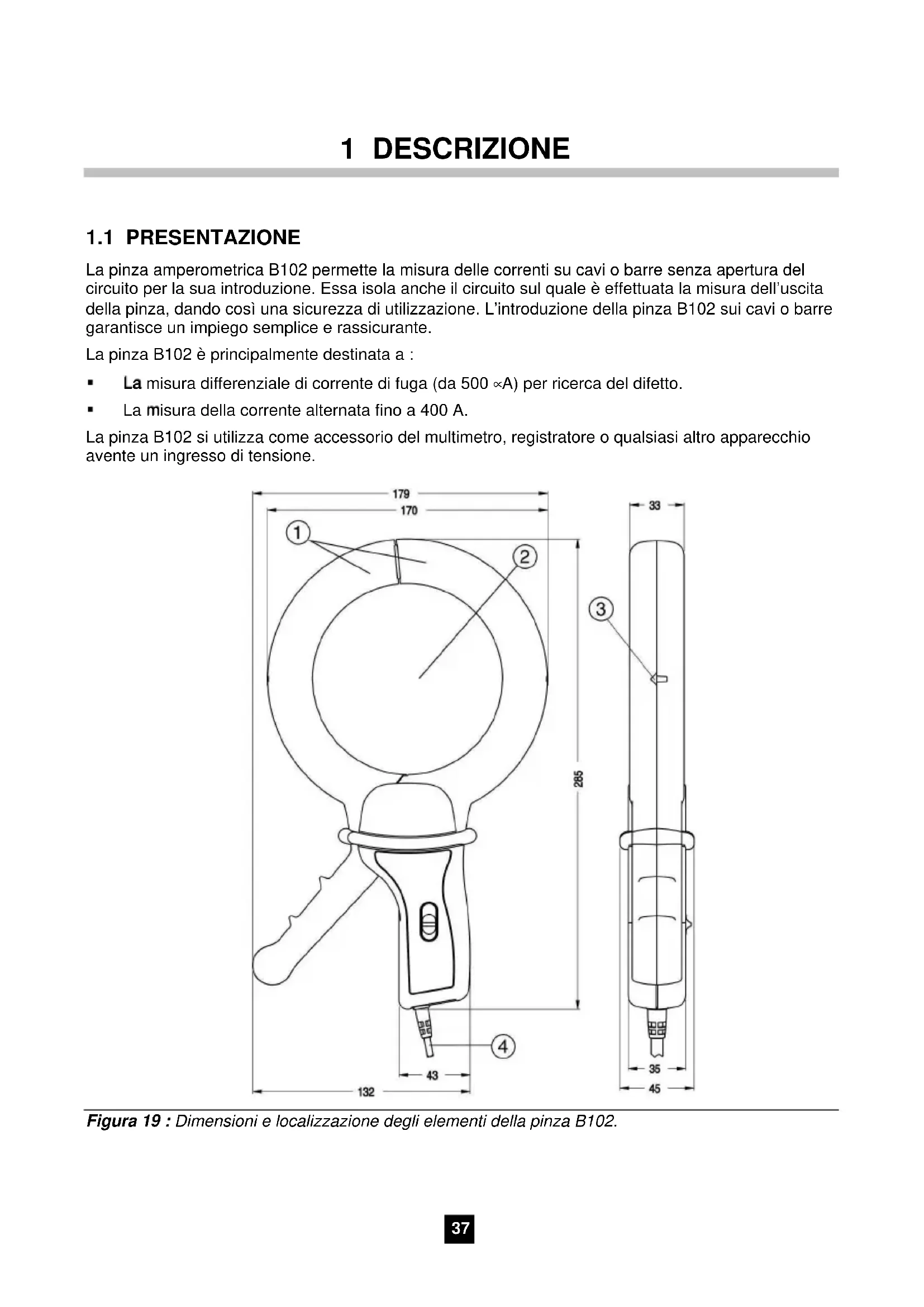 La misura della corrente alternata fino a 400 A. La pinza B102 si utilizza come accessorio del multimetro, registratore o qualsiasi altro apparecchio avente un ingresso di tensione. Figura 19 : Dimensioni e localizzazione degli elementi della pinza B102.38 Gli elementi si ripartiscono come segue (figura 1) :