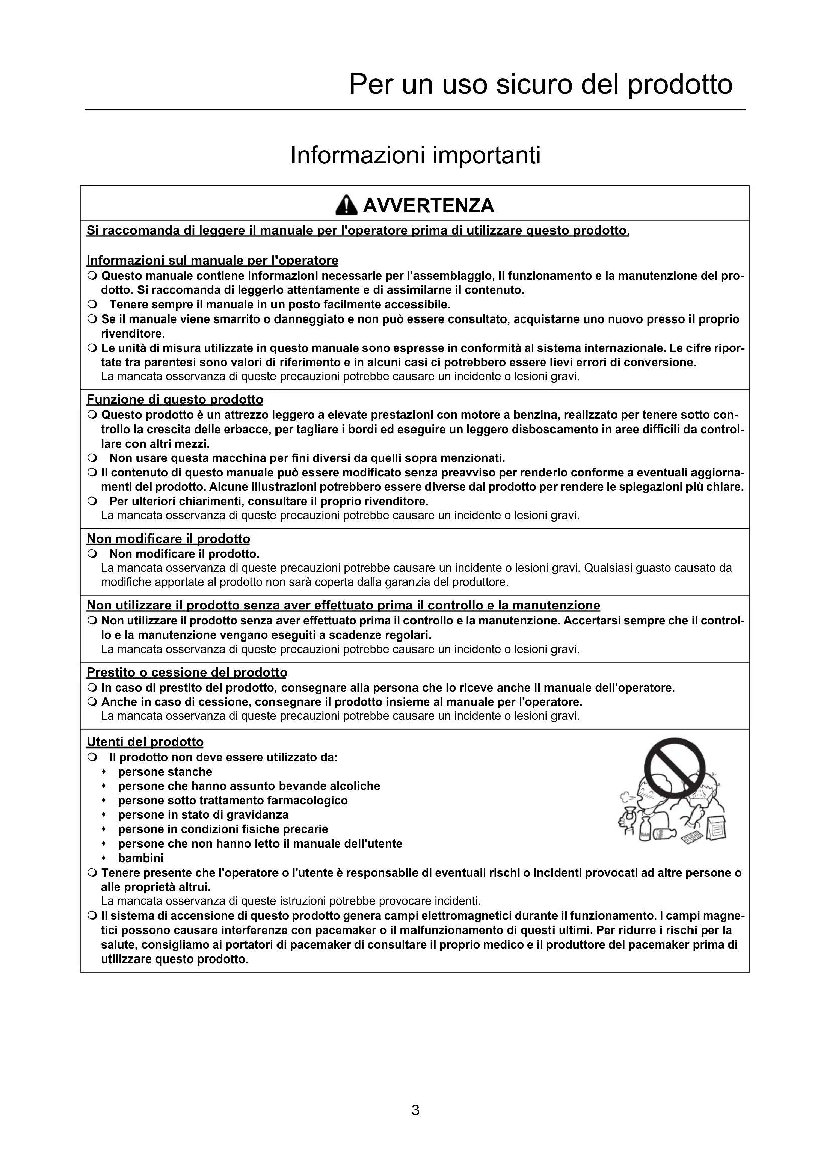 - Dichiarazione di conformità Per un uso sicuro del prodotto Per un us o sicuro del prodotto Informazioni importanti AVVERTENZA Si raccomanda di leggere il manuale per l'operatore prima di utilizzare questo prodotto. Informazioni sul manuale per l'operatore Questo manuale contiene informazioni necessarie per l'assemblaggio, il funzionamento e la manutenzione del pro- dotto. Si raccomanda di leggerlo attentamente e di assimilarne il contenuto. Tenere sempre il manuale in un posto facilmente accessibile. Se il manuale viene smarrito o danneggiato e non può essere consultato, acquistarne uno nuovo presso il proprio rivenditore. Le unità di misura utilizzate in questo manuale sono espresse in conformità al sistema internazionale. Le cifre ripor- tate tra parentesi sono valori di riferimento e in alcuni casi ci potrebbero essere lievi errori di conversione. La mancata osservanza di queste precauzioni potrebbe causare un incidente o lesioni gravi. Funzione di questo prodotto Questo prodotto è un attrezzo leggero a elevate prestazioni con motore a benzina, realizzato per tenere sotto con- trollo la crescita delle erbacce, per tagliare i bordi ed eseguire un leggero disboscamento in aree difficili da control- lare con altri mezzi. Non usare questa macchina per fini diversi da quelli sopra menzionati. Il contenuto di questo manuale può essere modificato senza preavviso per renderlo conforme a eventuali aggiorna- menti del prodotto. Alcune illustrazioni potrebbero essere diverse dal prodotto per rendere le spiegazioni più chiare. Per ulteriori chiarimenti, consultare il proprio rivenditore.La mancata osservanza di queste precauzioni potrebbe causare un incidente o lesioni gravi. Non modificare il prodotto Non modificare il prodotto. La mancata osservanza di queste precauzioni potrebbe causare un incidente o lesioni gravi. Qualsiasi guasto causato da modifiche apportate al prodotto non sarà coperta dalla garanzia del produttore. Non utilizzare il prodotto senza aver effettuato prima il controllo e la manutenzione Non utilizzare il prodotto senza aver effettuato prima il controllo e la manutenzione. Accertarsi sempre che il control- lo e la manutenzione vengano eseguiti a scadenze regolari.La mancata osservanza di queste precauzioni potrebbe causare un incidente o lesioni gravi. Prestito o cessione del prodotto In caso di prestito del prodotto, consegnare alla persona che lo riceve anche il manuale dell'operatore. Anche in caso di cessione, consegnare il prodotto insieme al manuale per l'operatore. La mancata osservanza di queste precauzioni potrebbe causare un incidente o lesioni gravi. Utenti del prodotto Il prodotto non deve essere utilizzato da: persone stanche persone che hanno assunto bevande alcoliche persone sotto trattamento farmacologico persone in stato di gravidanza persone in condizioni fisiche precarie persone che non hanno letto il manuale dell'utente bambini Tenere presente che l'operatore o l'utente è responsabile di eventuali rischi o incidenti provocati ad altre persone o alle proprietà altrui.La mancata osservanza di queste istruzioni potrebbe provocare incidenti. Il sistema di accensione di questo prodotto genera campi elettromagnetici durante il funzionamento. I campi magne- tici possono causare interferenze con pacemaker o il malfunzionamento di questi ultimi. Per ridurre i rischi per la salute, consigliamo ai portatori di pacemaker di consultare il proprio medico e il produttore del pacemaker prima di utilizzare questo prodotto.4 Per un uso sicuro del prodotto Vibrazioni e freddo Si ritiene che una condizione definita fenomeno di Raynaud, che colpisce le dita di alcune persone, sia causata dall'esposizione alle vibrazioni e al freddo. L'esposizione al freddo e alle vibrazioni può causare formicolio e brucio- re, seguiti da pallore e intorpidimento delle dita. Si consiglia vivamente di osservare le seguenti precauzioni in quan- to non si conosce l'esposizione minima che causa i disturbi. Tenere il corpo caldo, soprattutto testa, collo, piedi, caviglie, mani e polsi. Mantenere una buona circolazione del sangue facendo vigorosi esercizi con le braccia durante frequenti pause di lavoro, ed evitare di fumare. Limitare il numero di ore di impiego. Cercare di pianificare altri lavori nell'arco della giornata lavorativa in cui non sia richiesto l'uso del decespugliatore/bordatore o di altro dispositivo portatile. Se si accusano disagi e disturbi e se si riscontrano arrossamenti e gonfiore delle dita seguiti da pallore e perdita di sensibilità, rivolgersi al proprio medico prima di esporsi di nuovo al freddo e alle vibrazioni. La mancata osservanza di queste istruzioni potrebbe causare danni alla salute. Lesioni da sforzi ripetitivi Si ritiene che l'uso eccessivo dei muscoli e dei tendini di dita, mani, braccia e spalle possa causare dolore, gonfiore, intorpidimento, debolezza e fortissimi dolori nelle zone menzionate. Alcune attività manuali ripetitive possono esse- re causa di alto rischio per lo sviluppo di lesioni da sforzi ripetitivi. Per ridurre il rischio di lesioni da sforzi ripetitivi: Evitare di usare il polso piegato, allungato o girato. Fare pause a intervalli regolari per ridurre al minimo i movimenti ripetuti e far riposare le mani. Ridurre la velocità e la forza con cui il movimento ripetitivo viene eseguito. Fare esercizi per rafforzare i muscoli delle mani e delle braccia. Consultare un medico se si avverte formicolio, intorpidimento o dolori nelle dita, nelle mani, nei polsi o nelle brac- cia. Una tempestiva diagnosi di lesioni da sforzi ripetitivi consente di evitare danni permanenti ai nervi e ai mu- scoli. La mancata osservanza di queste istruzioni potrebbe causare danni alla salute. Addestramento Non permettere a nessuno di azionare l'attrezzo senza idoneo addestramento o mezzi di protezione adeguati. Acquisire dimestichezza con i comandi e il corretto impiego dell'attrezzo. Imparare ad arrestare l'attrezzo e a spegnere il motore. Imparare a sgancia