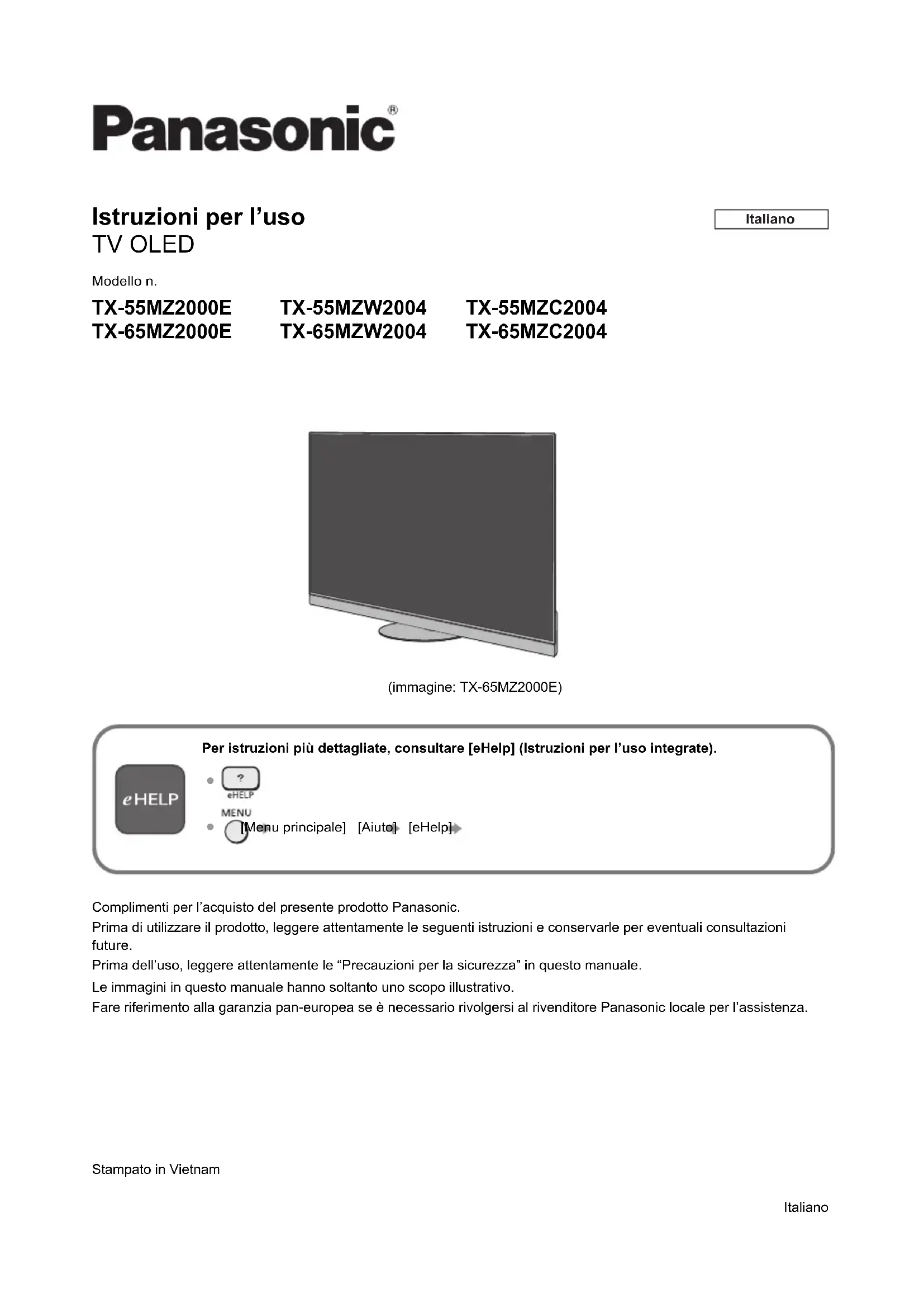 sono disponibili su questo televisore. È possibile utilizzare fino a 5 dispositivi contemporaneamente. <Nota> ≥ Dati tecnici e design sono soggetti a modifiche senza preavviso. Il peso e le dimensioni indicati sono approssimativi. ≥ Per informazioni sul software open source, vedere [eHelp] (Ricerca per criterio > Leggere prima > Prima dell’uso > Licenza). ≥ Per ulteriori informazioni sul prodotto, visitare EPREL: https://eprel.ec.europa.eu. Il numero di registrazione EPREL è disponibile qui https://eprel.panasonic.eu/product. Modello da 55” Modello da 65” Modello da 55” Modello da 65” Registrazione dell’utente Il numero del modello e il numero di serie di questo prodotto sono riportati sul pannello posteriore. Scrivere questo numero di serie nello spazio sottostante e conservare questo libretto e la ricevuta di acquisto come prova attestante l’acquisto che potrebbe essere utile a identificarlo in caso di furto o perdita e ai fini della garanzia. Modello No. Numero di serie TX-55_65MZ2000E_MZx2004_TQB5ZA0037_eng_ger_spa_ita_fre_cze_pol.book 15 ページ 2023年3月13日 月曜日 午前9時24 分TX-55_65MZ2000E_MZx2004_TQB5ZA0037_eng_ger_spa_ita_fre_cze_pol.book 16 ページ 2023年3月13日 月曜日 午前9時24 分Mode d’emploi Téléviseur OLED Numéro de modèle TX-55MZ2000E TX-65MZ2000E TX-55MZW2004 TX-65MZW2004 TX-55MZC2004 TX-65MZC2004 (image : TX-65MZ2000E) Pour avoir des instructions plus détaillées, veuillez consulter [AIDE] (Mode d’emploi intégré).