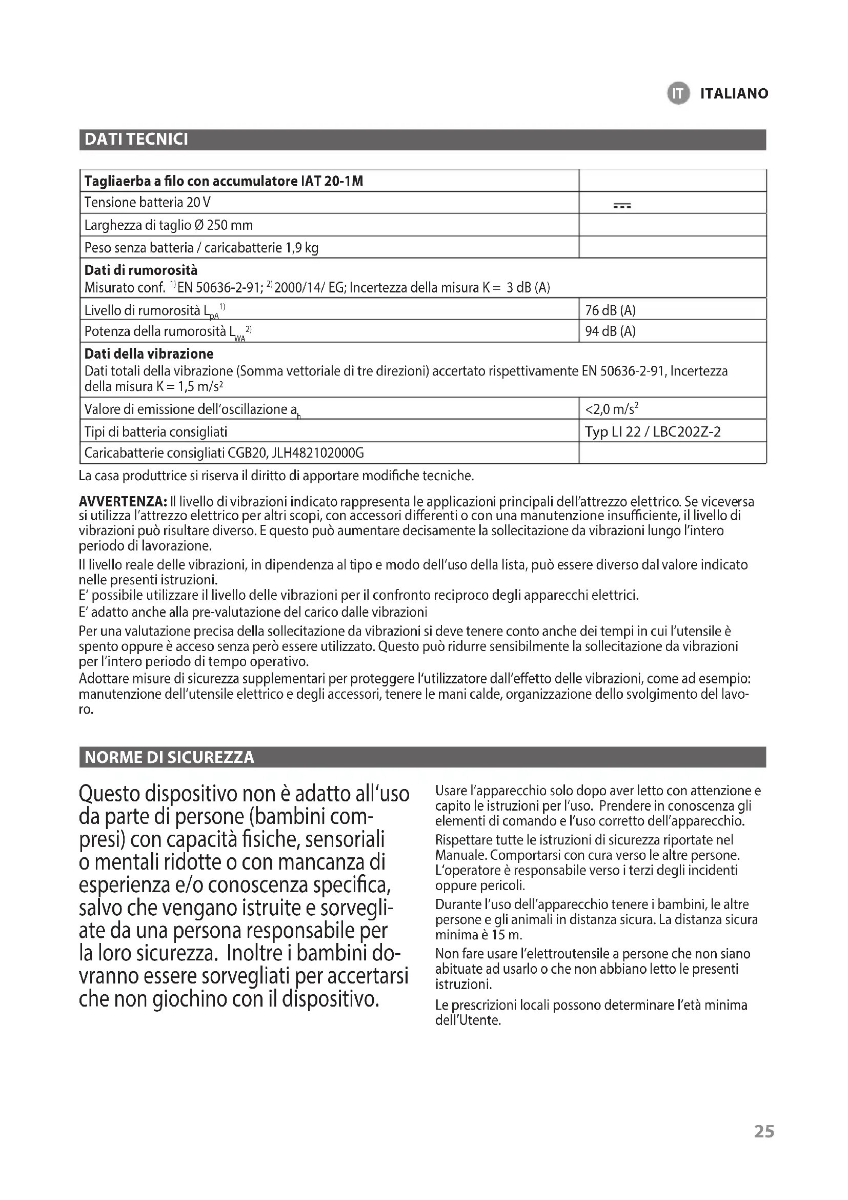 FRANÇAIS25 DATI TECNICI Tagliaerba a lo con accumulatore IAT 20-1M Tensione batteria 20 V Larghezza di taglio Ø 250 mm Peso senza batteria / caricabatterie 1,9 kg Dati di rumorosità Misurato conf.