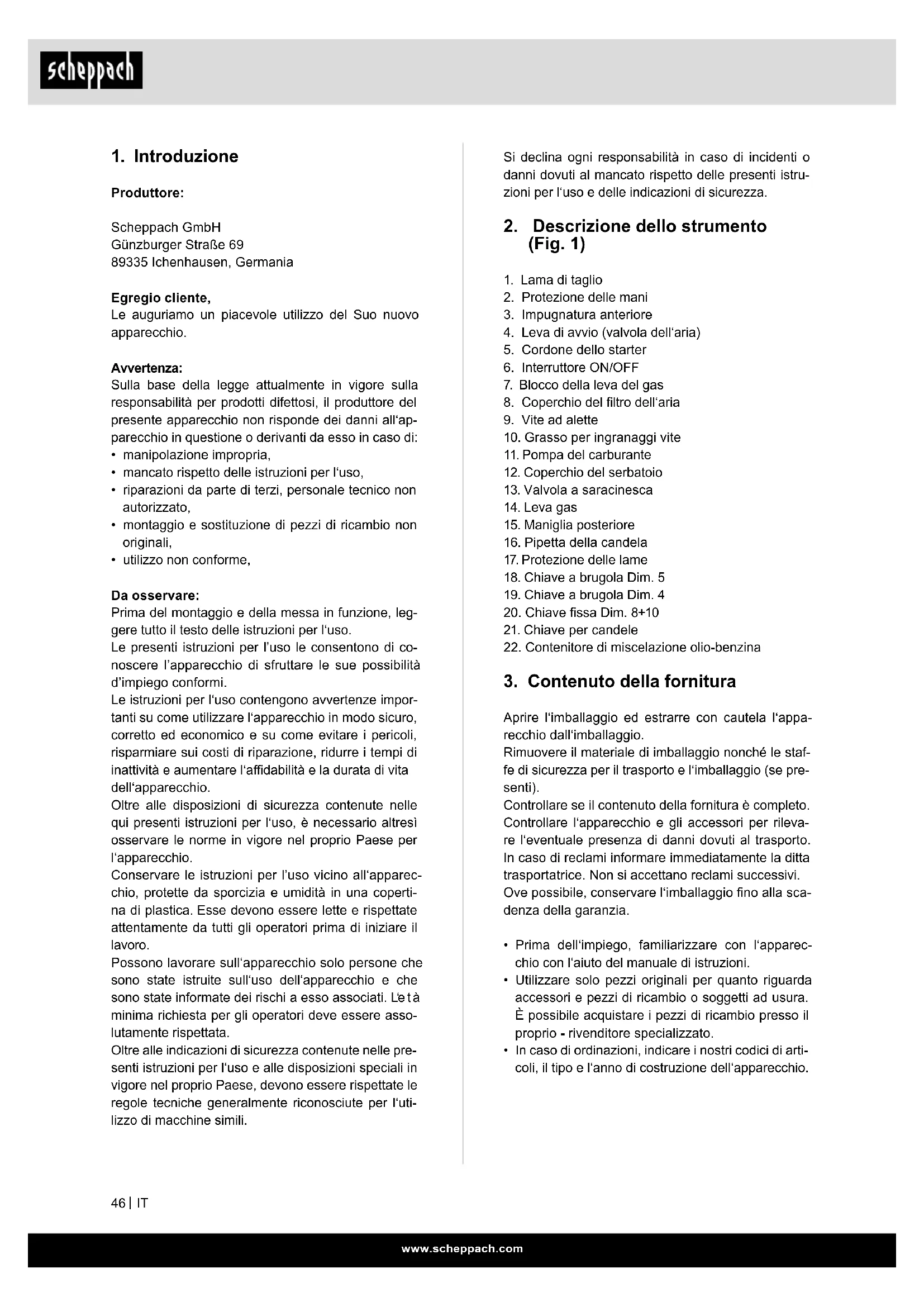 Produttore: Scheppach GmbH Günzburger Straße 69 89335 Ichenhausen, Germania Egregio cliente, Le auguriamo un piacevole utilizzo del Suo nuovo apparecchio. Avvertenza: Sulla base della legge attualmente in vigore sulla responsabilità per prodotti difettosi, il produttore del presente apparecchio non risponde dei danni all‘ap- parecchio in questione o derivanti da esso in caso di: