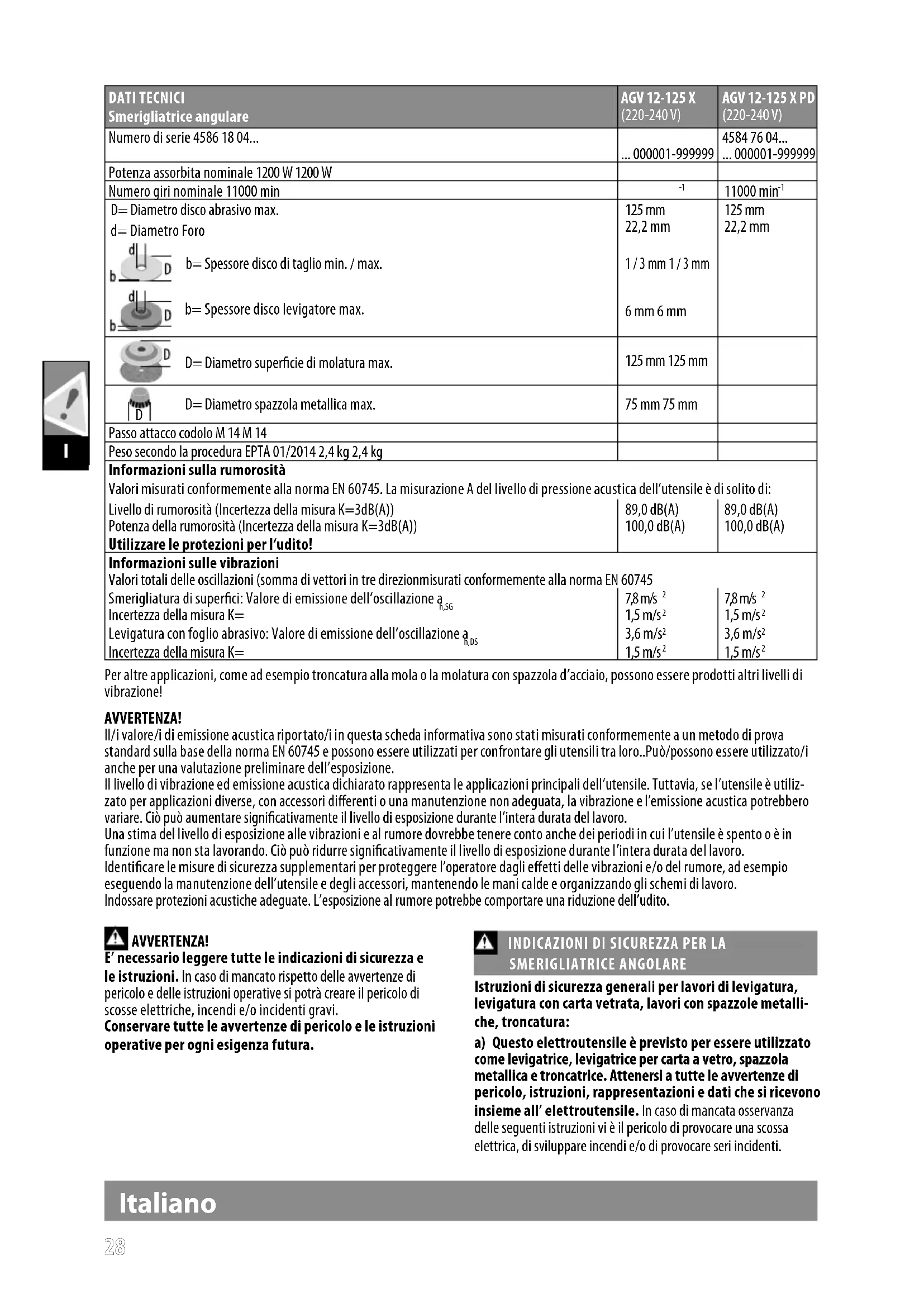 Per altre applicazioni, come ad esempio troncatura alla mola o la molatura con spazzola d’acciaio, possono essere prodotti altri livelli di vibrazione! AVVERTENZA! Il/i valore/i di emissione acustica riportato/i in questa scheda informativa sono stati misurati conformemente a un metodo di prova standard sulla base della norma EN 60745 e possono essere utilizzati per confrontare gli utensili tra loro..Può/possono essere utilizzato/i anche per una valutazione preliminare dell’esposizione. Il livello di vibrazione ed emissione acustica dichiarato rappresenta le applicazioni principali dell’utensile. Tuttavia, se l’utensile è utiliz- zato per applicazioni diverse, con accessori dierenti o una manutenzione non adeguata, la vibrazione e l’emissione acustica potrebbero variare. Ciò può aumentare signicativamente il livello di esposizione durante l’intera durata del lavoro. Una stima del livello di esposizione alle vibrazioni e al rumore dovrebbe tenere conto anche dei periodi in cui l’utensile è spento o è in funzione ma non sta lavorando. Ciò può ridurre signicativamente il livello di esposizione durante l’intera durata del lavoro. Identicare le misure di sicurezza supplementari per proteggere l’operatore dagli eetti delle vibrazioni e/o del rumore, ad esempio eseguendo la manutenzione dell’utensile e degli accessori, mantenendo le mani calde e organizzando gli schemi di lavoro. Indossare protezioni acustiche adeguate. L’esposizione al rumore potrebbe comportare una riduzione dell’udito. AVVERTENZA! E’ necessario leggere tutte le indicazioni di sicurezza e le istruzioni. In caso di mancato rispetto delle avvertenze di pericolo e delle istruzioni operative si potrà creare il pericolo di scosse elettriche, incendi e/o incidenti gravi. Conservare tutte le avvertenze di pericolo e le istruzioni operative per ogni esigenza futura.