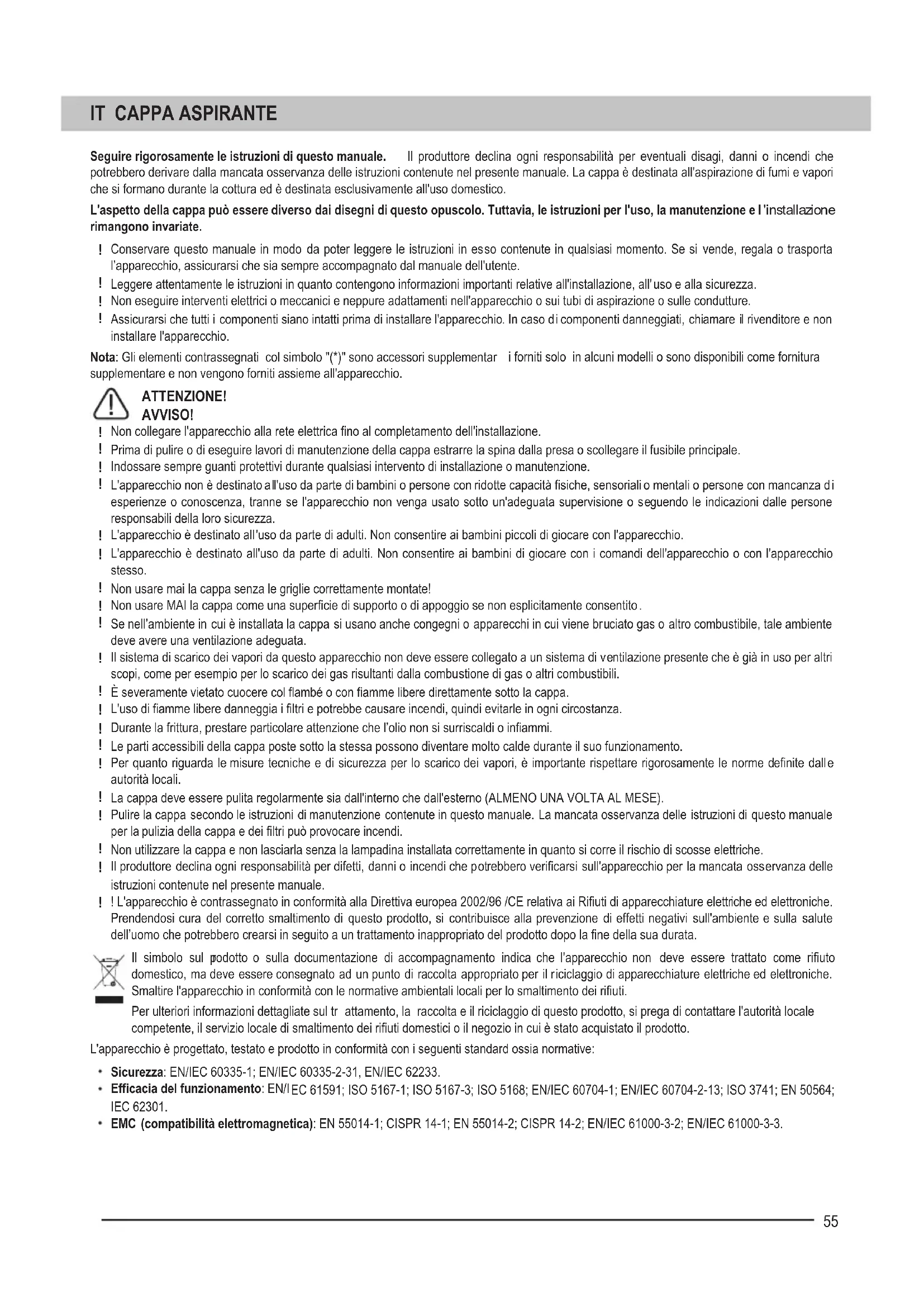autorità locali. La cappa deve essere pulita regolarmente sia dall'interno che dall'esterno (ALMENO UNA VOLTA AL MESE). Pulire la cappa secondo le istruzioni di manutenzione contenute in questo manuale. La mancata osservanza delle istruzioni di questo manuale per la pulizia della cappa e dei filtri può provocare incendi. Non utilizzare la cappa e non lasciarla senza la lampadina installata correttamente in quanto si corre il rischio di scosse elettriche. Il produttore declina ogni responsabilità per difetti, danni o incendi che potrebbero verificarsi sull'apparecchio per la mancata oss ervanza delle istruzioni contenute nel presente manuale. ! L'apparecchio è co ntrassegnato in conformità alla Direttiva europea 2002/96 /CE relativa ai Rifiuti di apparecchiature elettriche ed elettroniche. Prendendosi cura del corretto smaltimento di questo prodotto, si contribuisce alla prevenzione di effetti negativi sull'ambiente e sulla salute dell’uomo che potrebbero crearsi in seguito a un trattamento inappropriato del prodotto dopo la fine della sua durata. Il simbolo sul p rodotto o sulla documentazione di accompagnamento indica che l'apparecchio non deve essere trattato come rifiuto domestico, ma deve essere consegnato ad un punto di raccolta appropriato per il riciclaggio di apparecchiature elettriche ed elettroniche. Smaltire l'apparecchio in conformità con le normative ambientali locali per lo smaltimento dei rifiuti. Per ulteriori informazioni dettagliate sul tr attamento, la raccolta e il riciclaggio di questo prodotto, si prega di contattare l'autorità locale competente, il servizio locale di smaltimento dei rifiuti domestici o il negozio in cui è stato acquistato il prodotto. L'apparecchio è progettato, testato e prodotto in conformità con i seguenti standard ossia normativ