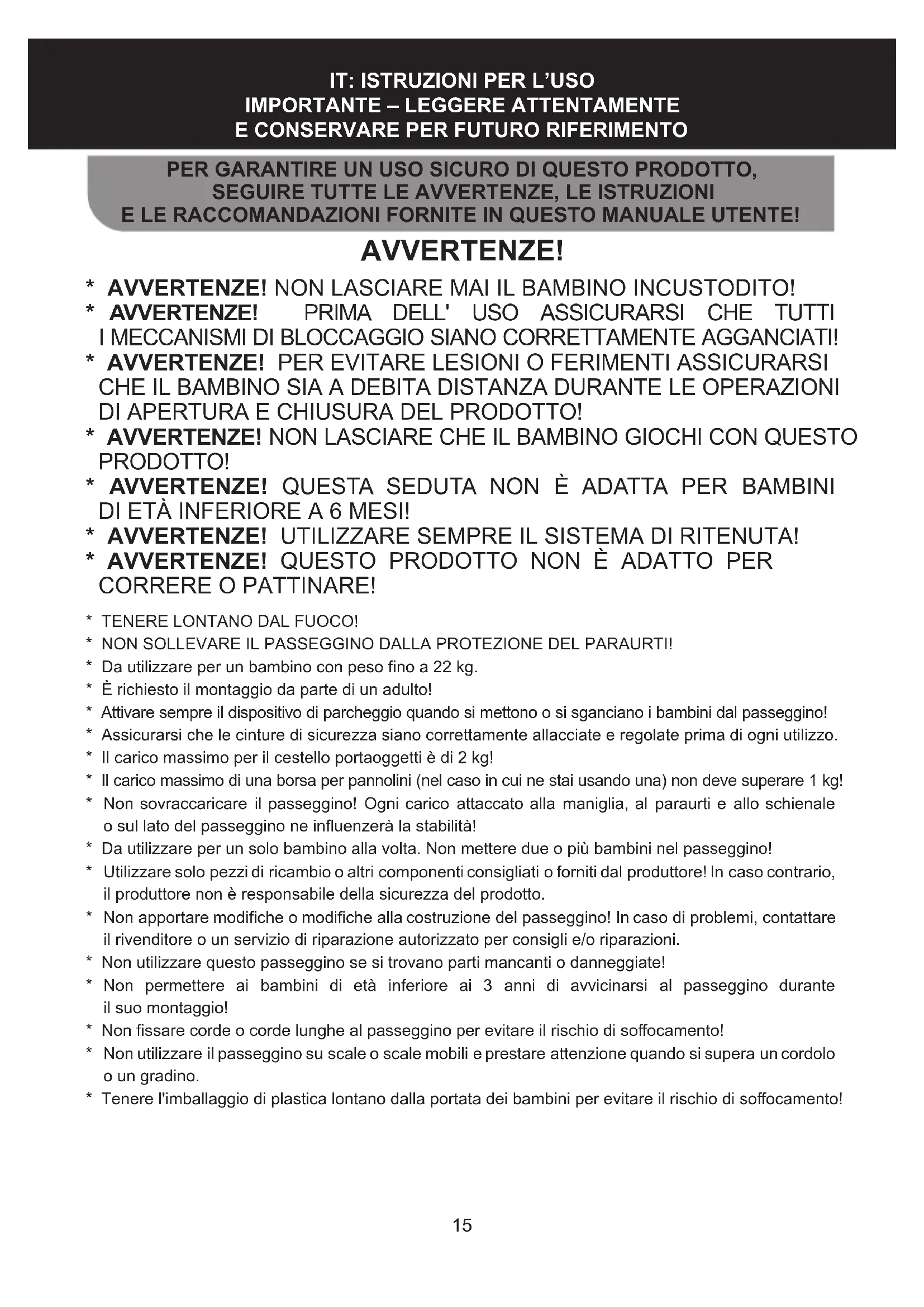 - Da utilizzare per un solo bambino alla volta. Non mettere due o più bambini nel passeggino!