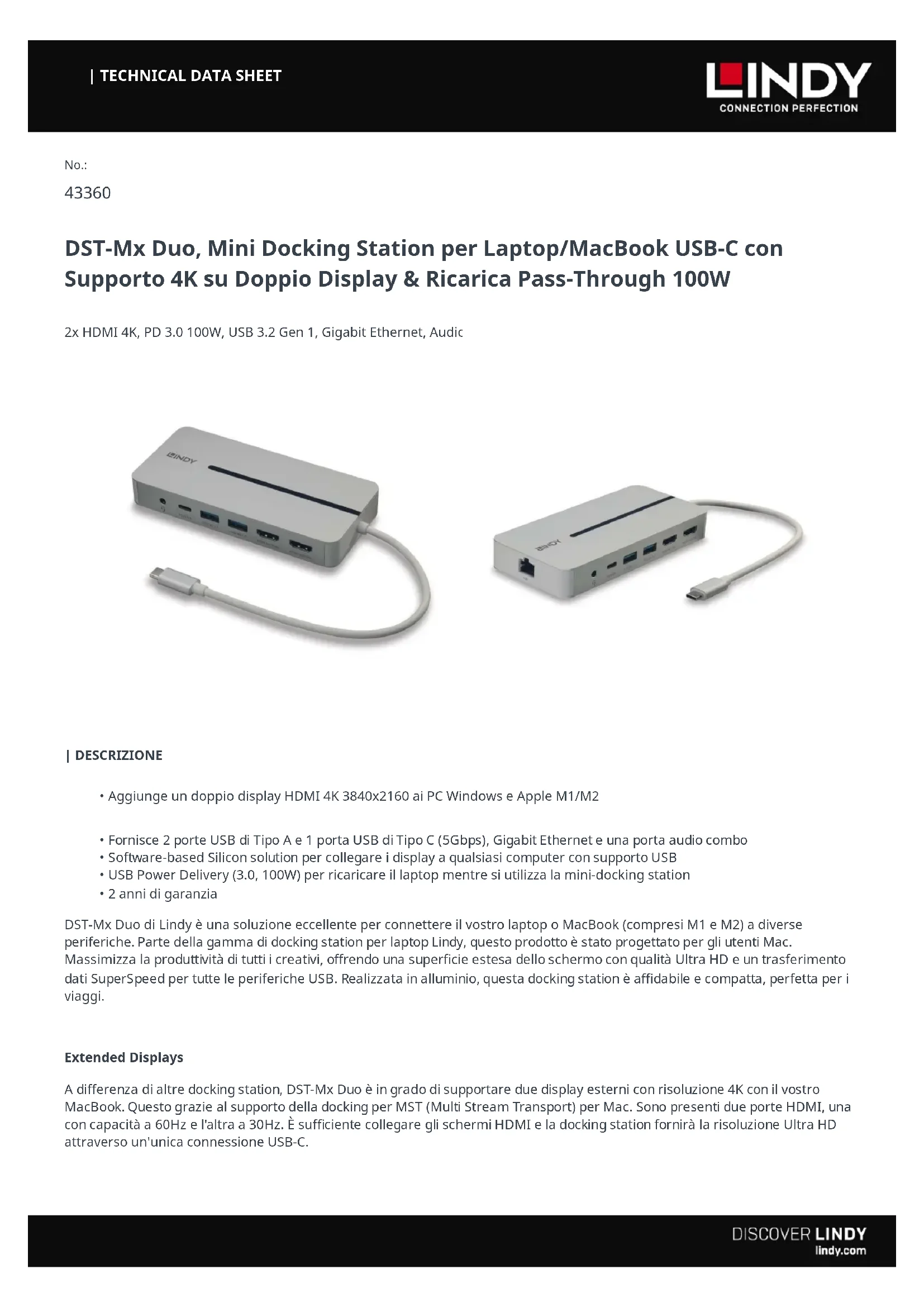 DST-Mx Duo, Mini Docking Station per Laptop/MacBook USB-C con Supporto 4K su Doppio Display & Ricarica Pass-Through 100W 2x HDMI 4K, PD 3.0 100W, USB 3.2 Gen 1, Gigabit Ethernet, Audio Aggiungeun doppio display HDMI 4K 3840x2160 ai PC Windows e Apple M1/M2 Fornisce2 porte USB di Tipo A e 1 porta USB di Tipo C (5Gbps), Gigabit Ethernet e una porta audio combo Software-based Silicon solutionper collegarei display a qualsiasi computer con supporto USB USB Power Delivery (3.0, 100W) per ricaricare il laptop mentre si utilizza la mini-docking station 2 anni di garanzia DST-Mx Duo di Lindy è una soluzione eccellente per connettere il vostro laptop o MacBook (compresi M1 e M2) a diverse periferiche. Parte della gamma di docking station per laptop Lindy, questo prodotto è stato progettato per gli utenti Mac. Massimizza la produttività di tutti i creativi, offrendo una superficie estesa dello schermo con qualità Ultra HD e un trasferimento dati SuperSpeed per tutte le periferiche USB. Realizzata in alluminio, questa docking station è affidabile e compatta, perfetta per i viaggi. Extended Displays A differenza di altre docking station, DST-Mx Duo è in grado di supportare due display esterni con risoluzione 4K con il vostro MacBook. Questo grazie al supporto della docking per MST (Multi Stream Transport) per Mac. Sono presenti due porte HDMI, una con capacità a 60Hz e l'altra a 30Hz. È sufficiente collegare gli schermi HDMI e la docking station fornirà la risoluzione Ultra HD attraverso un'unica connessione USB-C.