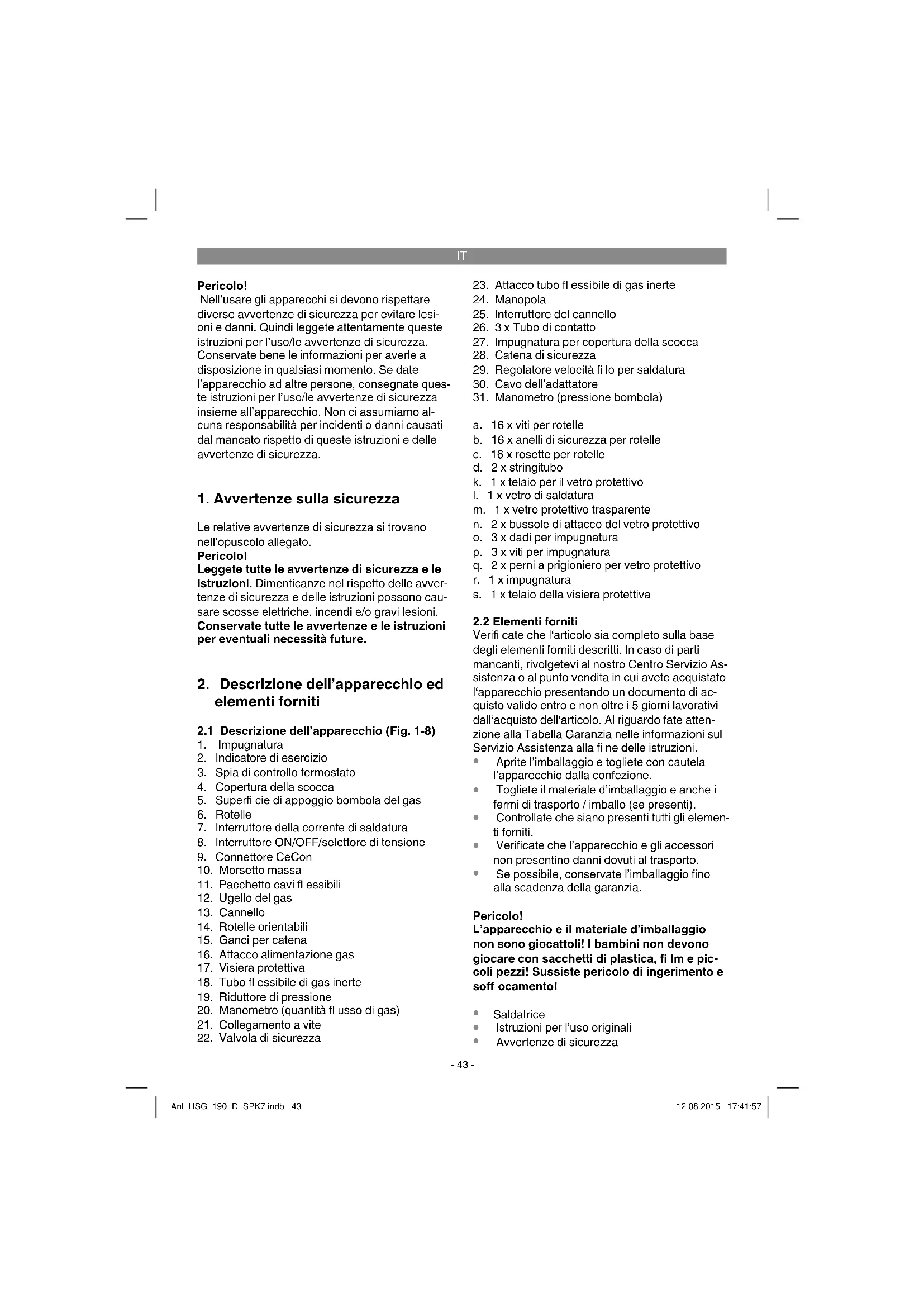 Pericolo! Nell’usare gli apparecchi si devono rispettare diverse avvertenze di sicurezza per evitare lesi- oni e danni. Quindi leggete attentamente queste istruzioni per l’uso/le avvertenze di sicurezza. Conservate bene le informazioni per averle a disposizione in qualsiasi momento. Se date l’apparecchio ad altre persone, consegnate ques- te istruzioni per l’uso/le avvertenze di sicurezza insieme all’apparecchio. Non ci assumiamo al- cuna responsabilità per incidenti o danni causati dal mancato rispetto di queste istruzioni e delle avvertenze di sicurezza.