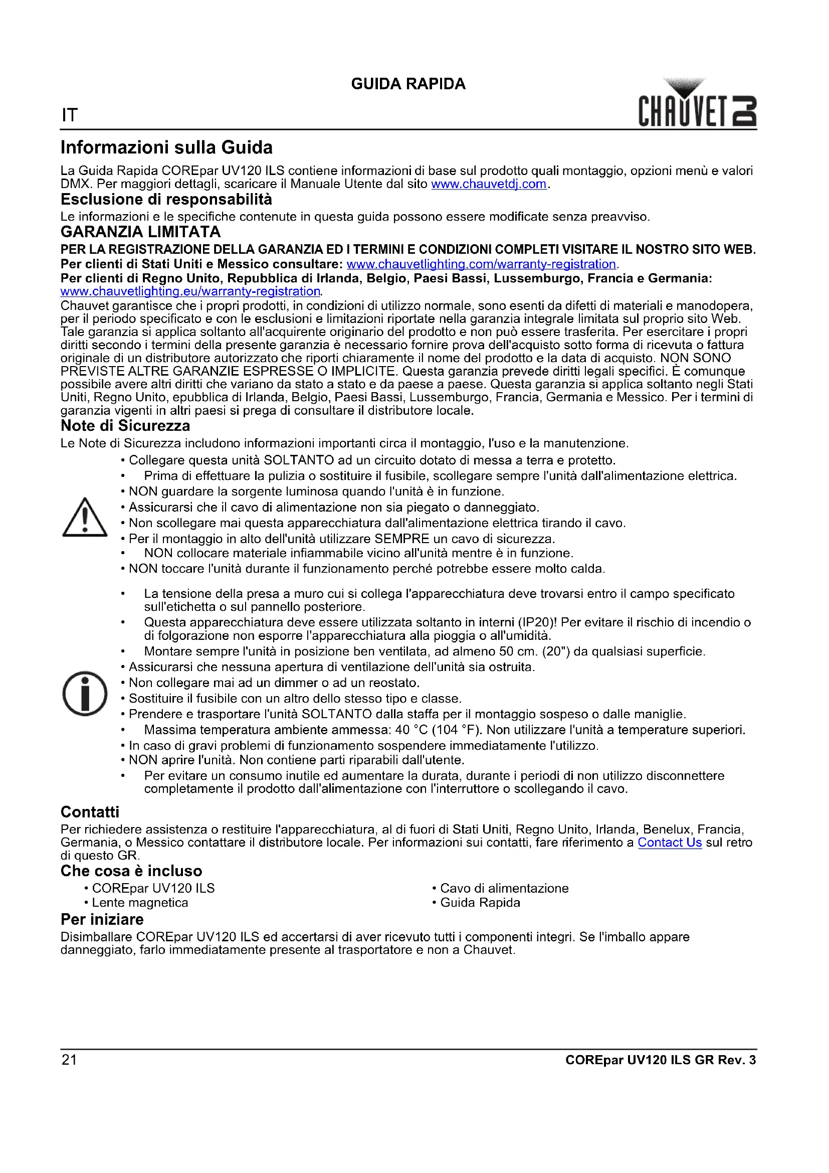 La Guida Rapida COREpar UV120 ILS contiene informazioni di base sul prodotto quali montaggio, opzioni menu e valori DMX. Per maggiori dettagli, scaricare il Manuale Utente dal site www.chauvetdj.com.