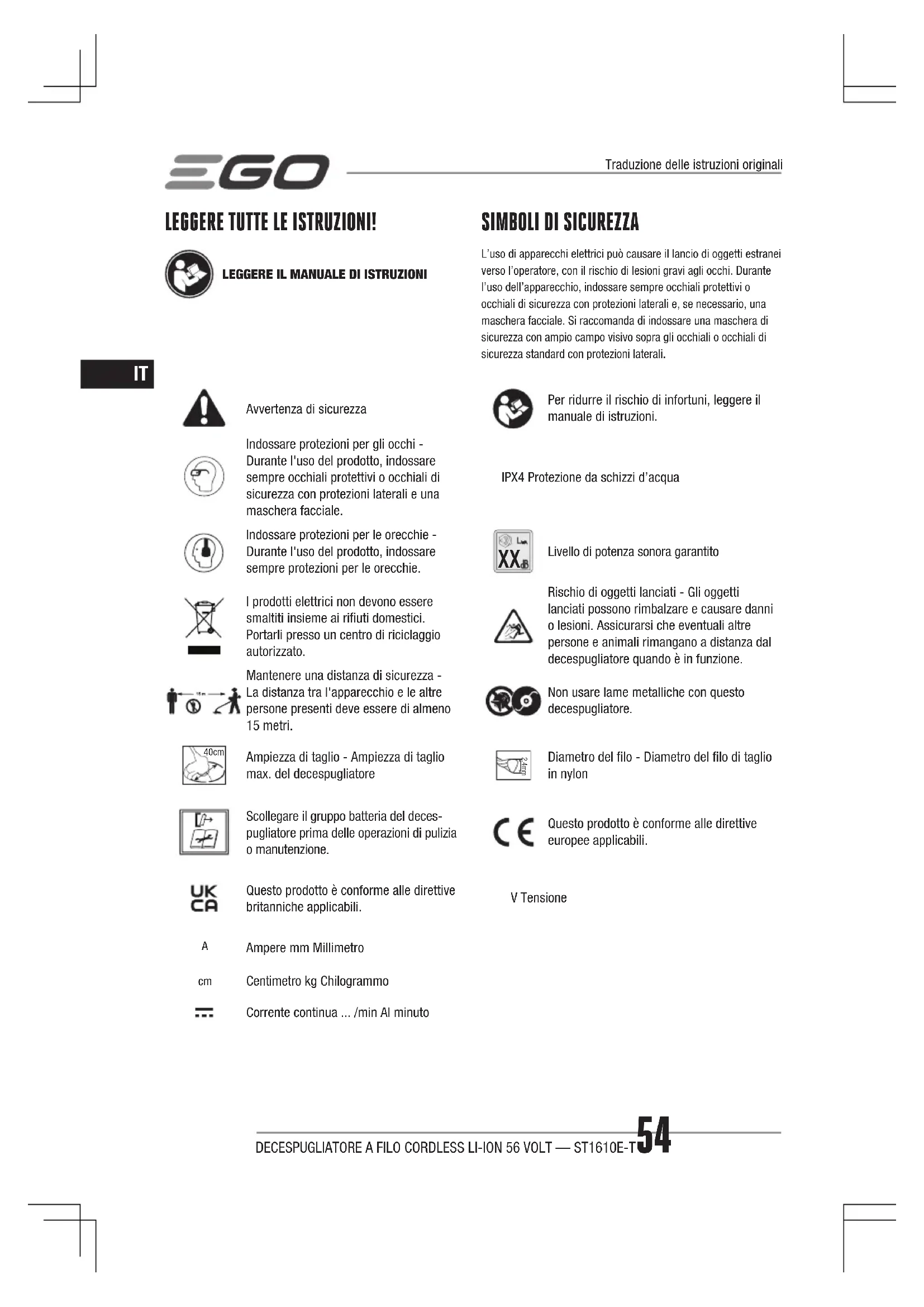 Scarica le istruzioni per il tuo Tagliaerba in formato PDF gratuitamente! Trova il tuo manuale ST1610ET - EGO e riprendi in mano il tuo dispositivo elettronico. In questa pagina sono pubblicati tutti i documenti necessari per l'utilizzo del tuo dispositivo. ST1610ET del marchio EGO.