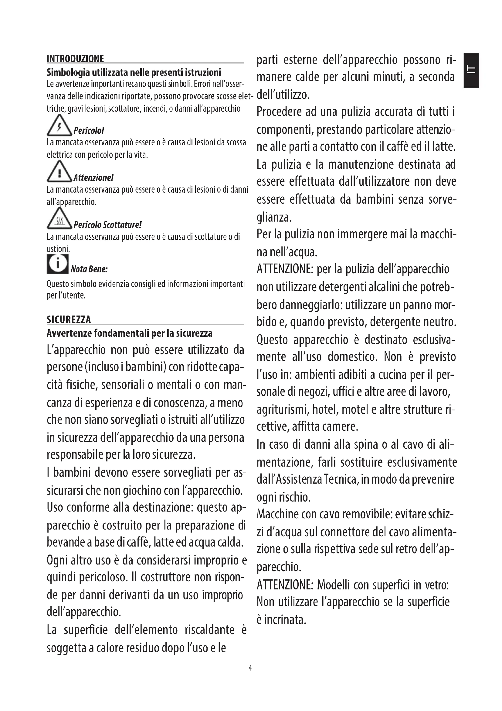 FIG. 74 INTRODUZIONE Simbologia utilizzata nelle presenti istruzioni Le avvertenze importanti recano questi simboli. Errori nell’osser- vanza delle indicazioni riportate, possono provocare scosse elet- triche, gravi lesioni, scottature, incendi, o danni all’apparecchio Pericolo! La mancata osservanza può essere o è causa di lesioni da scossa elettrica con pericolo per la vita. Attenzione! La mancata osservanza può essere o è causa di lesioni o di danni all’apparecchio. Pericolo Scottature! La mancata osservanza può essere o è causa di scottature o di ustioni. Nota Bene: Questo simbolo evidenzia consigli ed informazioni importanti per l’utente. SICUREZZA Avvertenze fondamentali per la sicurezza L’apparecchio non può essere utilizzato da persone (incluso i bambini) con ridotte capa- cità fisiche, sensoriali o mentali o con man- canza di esperienza e di conoscenza, a meno che non siano sorvegliati o istruiti all’utilizzo in sicurezza dell’apparecchio da una persona responsabile per la loro sicurezza. I bambini devono essere sorvegliati per as- sicurarsi che non giochino con l’apparecchio. Uso conforme alla destinazione: questo ap- parecchio è costruito per la preparazione di bevande a base di caffè, latte ed acqua calda. Ogni altro uso è da considerarsi improprio e quindi pericoloso. Il costruttore non rispon- de per danni derivanti da un uso improprio dell’apparecchio. La superficie dell’elemento riscaldante è soggetta a calore residuo dopo l’uso e le parti esterne dell’apparecchio possono ri- manere calde per alcuni minuti, a seconda dell’utilizzo. Procedere ad una pulizia accurata di tutti i componenti, prestando particolare attenzio- ne alle parti a contatto con il caffè ed il latte. La pulizia e la manutenzione destinata ad essere effettuata dall’utilizzatore non deve essere effettuata da bambini senza sorve- glianza. Per la pulizia non immergere mai la macchi- na nell’acqua. ATTENZIONE: per la pulizia dell’apparecchio non utilizzare detergenti alcalini che potreb- bero danneggiarlo: utilizzare un panno mor- bido e, quando previsto, detergente neutro. Questo apparecchio è destinato esclusiva- mente all’uso domestico. Non è previsto l’uso in: ambienti adibiti a cucina per il per- sonale di negozi, uffici e altre aree di lavoro, agriturismi, hotel, motel e altre strutture ri- cettive, affitta camere. In caso di danni alla spina o al cavo di ali- mentazione, farli sostituire esclusivamente dall’Assistenza Tecnica, in modo da prevenire ogni rischio. Macchine con cavo removibile: evitare schiz- zi d’acqua sul connettore del cavo alimenta- zione o sulla rispettiva sede sul retro dell’ap- parecchio. ATTENZIONE: Modelli con superfici in vetro: Non utilizzare l’apparecchio se la superficie è incrinata. IT5 SOLO PER MERCATI EUROPEI: Questo apparecchio può essere utilizzato da bambini di età da 8 anni in su se sotto sorve- glianza oppure se hanno ricevuto delle istru- zioni riguardanti l’utilizzo dell’apparecchio in sicurezza e se capiscono i pericoli implica- ti. Le operazioni di pulizia e di manutenzione da parte dell’utilizzatore non devono essere effettuate dai bambini a meno che non ab- biano un’età superiore 8 anni e operino sotto sorveglianza. Tenere l’apparecchio e il suo cavo fuori dalla portata dei bambini con età inferiore agli 8 anni. L’apparecchio può essere utilizzato da per- sone con ridotte capacità fisiche, sensoriali o mentali o con mancanza di esperienza e di conoscenza se hanno una sorveglianza op- pure se hanno ricevuto delle istruzioni a ri- guardo dell’uso in sicurezza dell’apparecchio e capiscono i pericoli implicati. I bambini non devono giocare con l’apparec- chio. Scollegare sempre l’apparecchio dall’ali- mentazione se lasciato incustodito e prima di montarlo, smontarlo o pulirlo. Le superfici che riportano questo sim- bolo diventano calde durante l’utilizzo (il simbolo è presente solo in alcuni modelli). Pericolo! Poiché l’apparecchio funziona a corrente elet- trica, attenersi alle seguenti avvertenze di sicurezza: