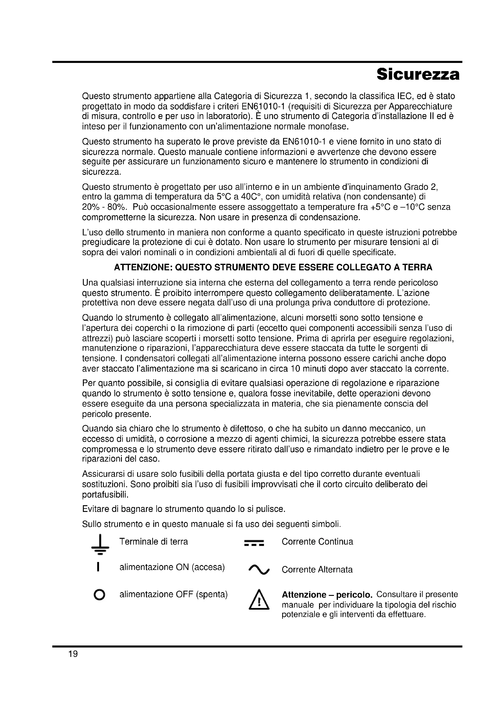 alimentazione OFF (spenta) Attenzione – pericolo. Consultare il presente manuale per individuare la tipologia del rischio potenziale e gli interventi da effettuare.20 Installazione Tensione d’esercizio Questo strumento è dotato di un’entrata universale e funziona con un’alimentazione a 115V o 230V senza regolazione. Controllare che la rete locale soddisfi i requisiti d’entrata indicati nella specifica. Cavo d’Alimentazione Collegare lo strumento all’alimentazione di rete in corrente alternata utilizzando il cavo fornito. Se dovesse essere necessaria una spina di alimentazione diversa, utilizzare un set completo della spina necessaria e di un connettore tipo IEC60320 C13 adeguatamente dimensionati e omologati. Per determinare la corrente minima nominale del set cavo necessario per l’alimentazione utilizzata, fare riferimento ai dati di potenza indicati sull’apparecchio stesso o nelle corrispondenti specifiche tecniche. ATTENZIONE! QUESTA STRUMENTO DEVE ESSERE COLLEGATA ALLA TERRA Una qualsiasi interruzione sia interna che esterna del collegamento a terra lo rende pericoloso. E’ proibito interrompere questo collegamento deliberatamente. Ventilazione Il dispositivo di alimentazione è molto efficiente ma a piena potenza può generare una quantità significativa di calore. Il raffreddamento è per convezione ed è perciò importante che la ventilazione non sia mai ristretta se si vogliono mantenere i livelli ottimali di rendimento e sicurezza. Se il dispositivo è montato in uno spazio ristretto, ad es. su una rastrelliera da 19 pollici, si deve provvedere una ventilazione adeguata usando, ad esempio, una base fornita di ventola. Collegamenti
